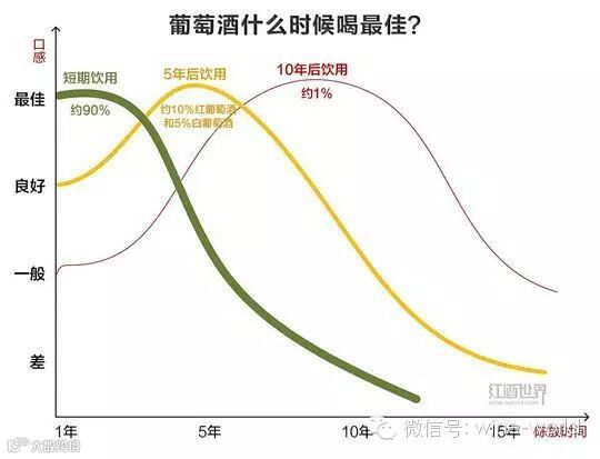 世界上90%以上的葡萄酒的最佳适饮期都是在1-2年内,只有4%左右的优质葡萄酒才具有5至10年的陈年潜力,仅有1%的顶级葡萄酒才具有10年以上的陈年潜力。所以,绝大多数葡萄酒应该在1-2年内喝掉,而不应该等到“十年之后,我们是朋友,还可以问候”。不然,十年之后,真的是“一边‘享受’,一边泪流”了。