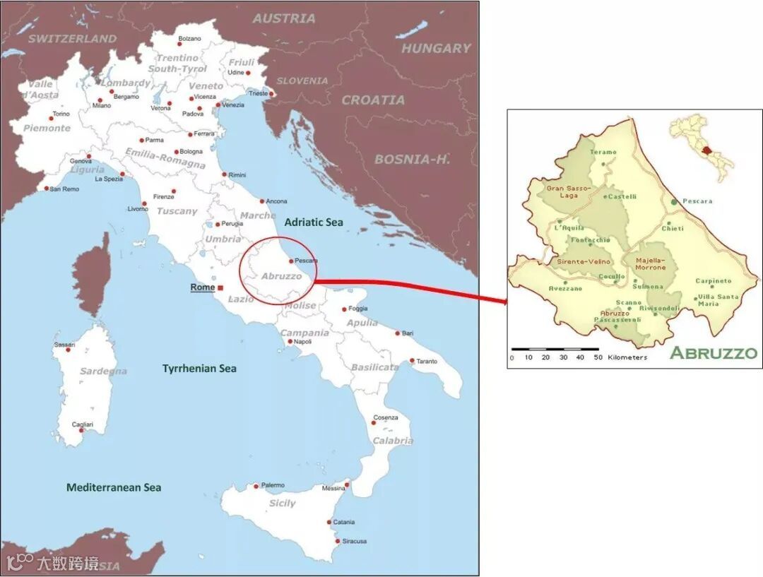 阿布鲁佐(Abruzzo)大区,东部面朝亚得里亚海(Adriatic Sea),北部与马尔凯(Marche)大区相接,西南部连接拉齐奥(Lazio)大区,东南部是莫利塞(Molise)大区。