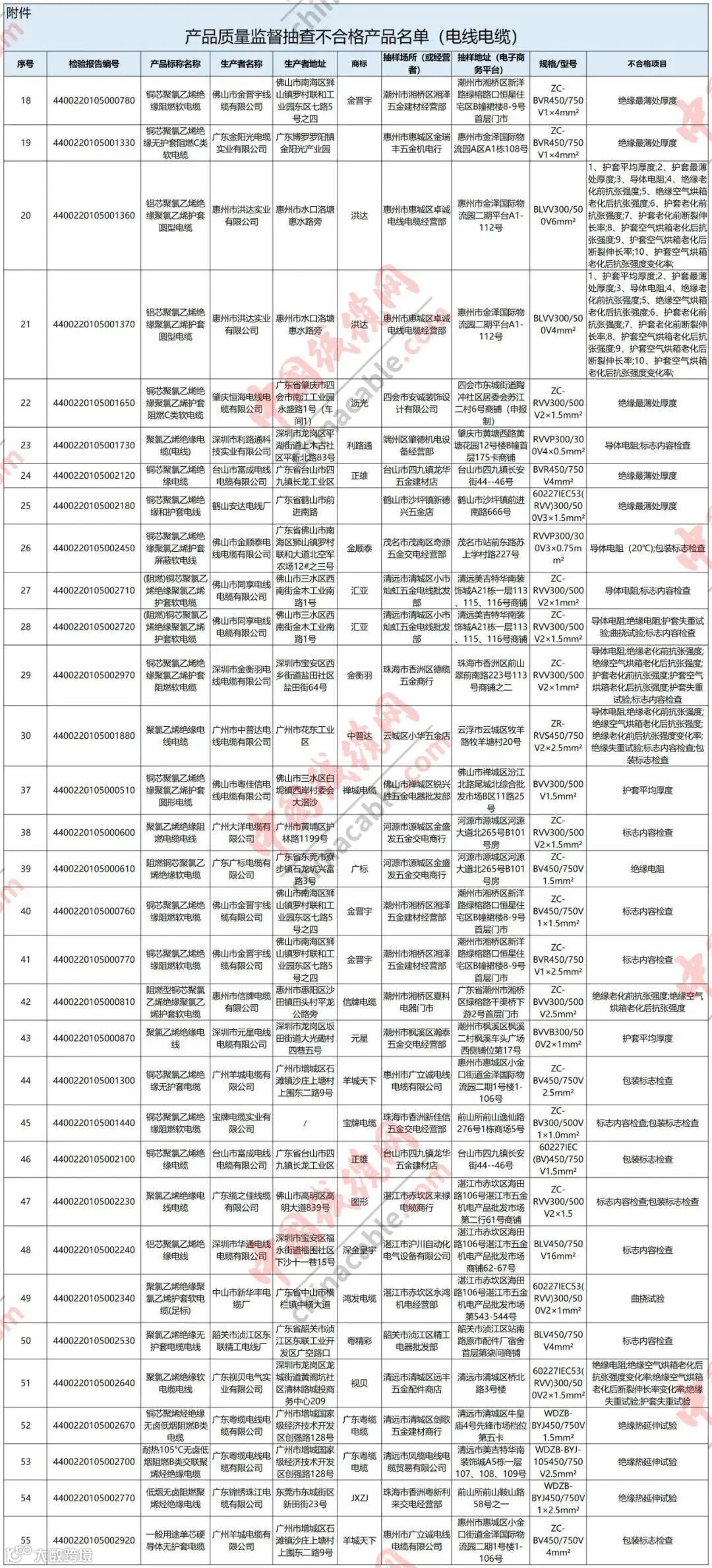 其中,电线电缆不合格32款,不合格样品涉及“信牌电缆”阻燃型铜芯聚氯乙烯绝缘聚氯乙烯护套软电缆、“宝牌电缆”铜芯聚氯乙烯绝缘阻燃软电缆等,详情见下表。