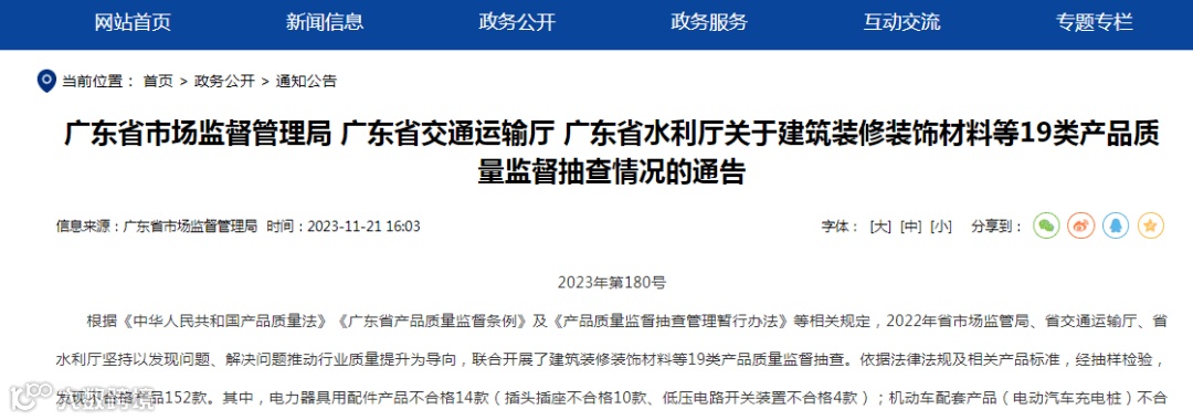 近期,广东省市场监督管理局网站发布《广东省市场监督管理局 广东省交通运输厅 广东省水利厅关于建筑装修装饰材料等19类产品质量监督抽查情况的通告》。据通告,经抽样检验,发现不合格产品152款。