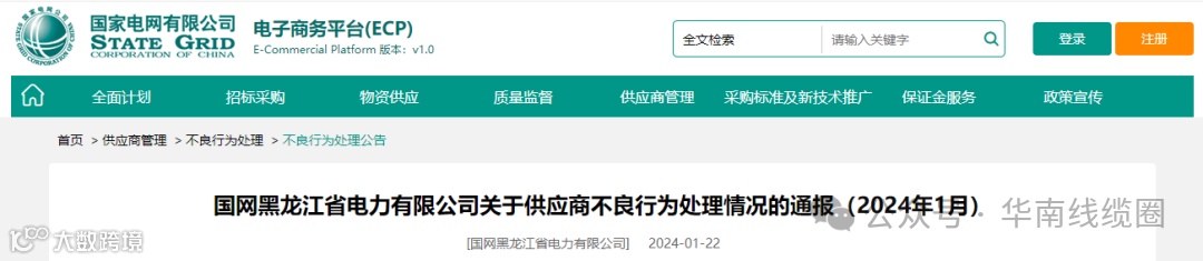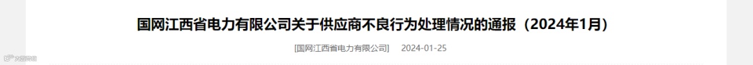 近日,国网电子商务平台陆续发布了《国网黑龙江省电力有限公司关于供应商不良行为处理情况的通报(2024年1月)》和《国网江西省电力有限公司关于供应商不良行为处理情况的通报(2024年1月)》。