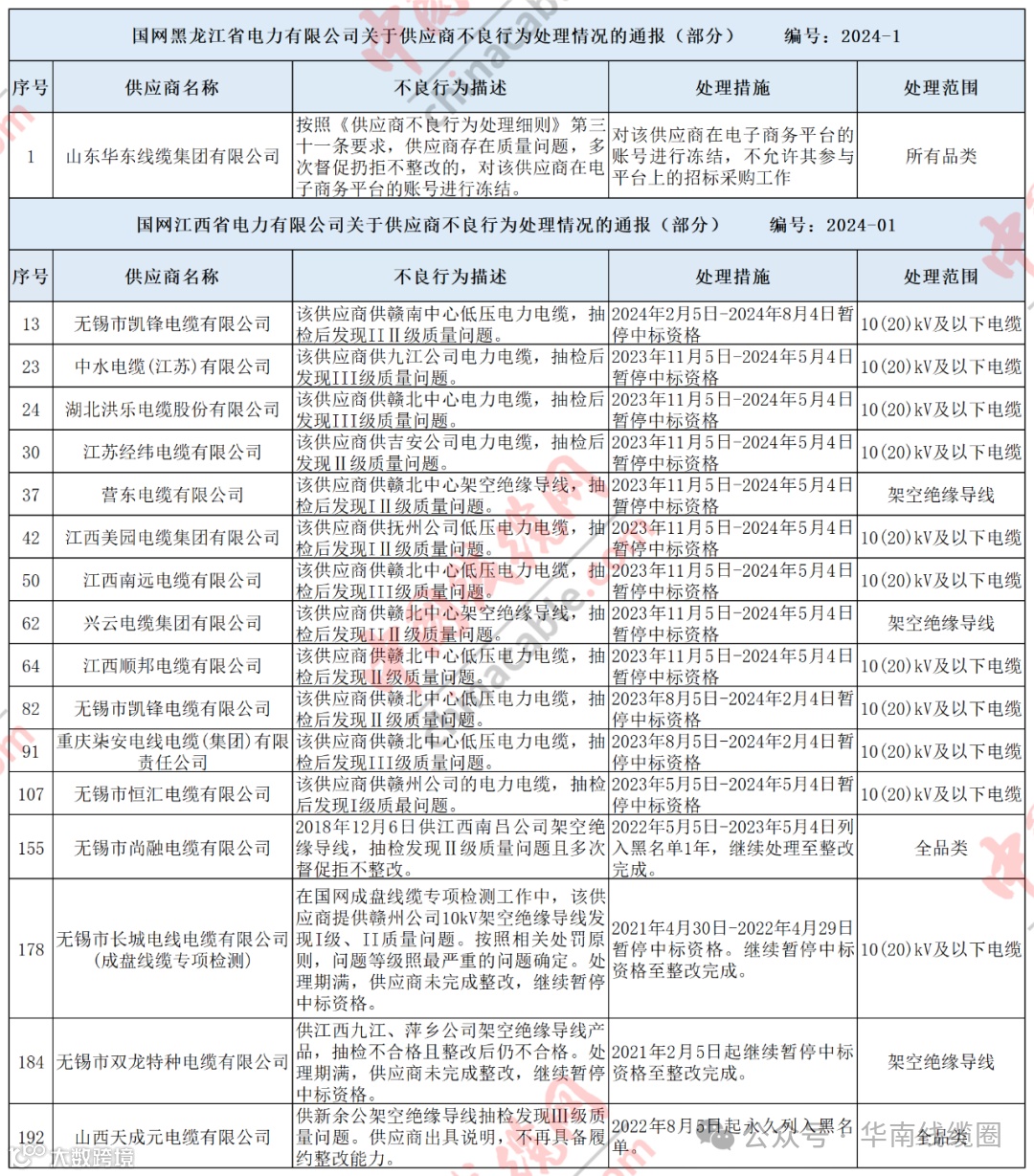 通报显示,山东华东线缆集团有限公司、无锡市凯锋电缆有限公司、中水电缆(江苏)有限公司、湖北洪乐电缆股份有限公司、江苏经纬电缆有限公司、营东电缆有限公司、江西美园电缆集团有限公司、江西南远电缆有限公司、兴云电缆集团有限公司、江西顺邦电缆有限公司、重庆柒安电线电缆(集团)有限责任公司、无锡市恒汇电缆有限公司、无锡市尚融电缆有限公司、无锡市长城电线电缆有限公司(成盘线缆专项检测)、无锡市双龙特种电缆有限公司、山西天成元电缆有限公司等16家线缆企业在列(具体处理情况表附后)。