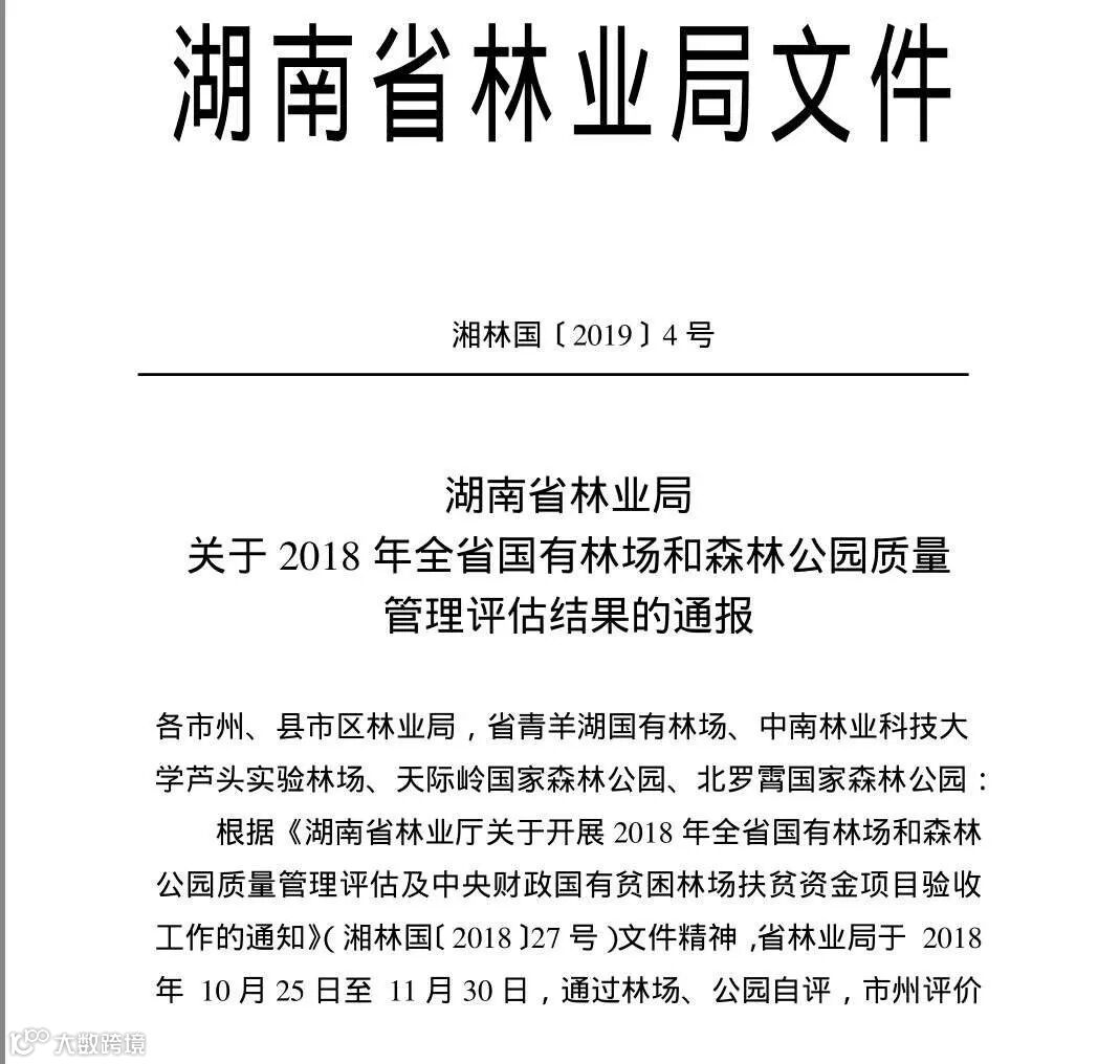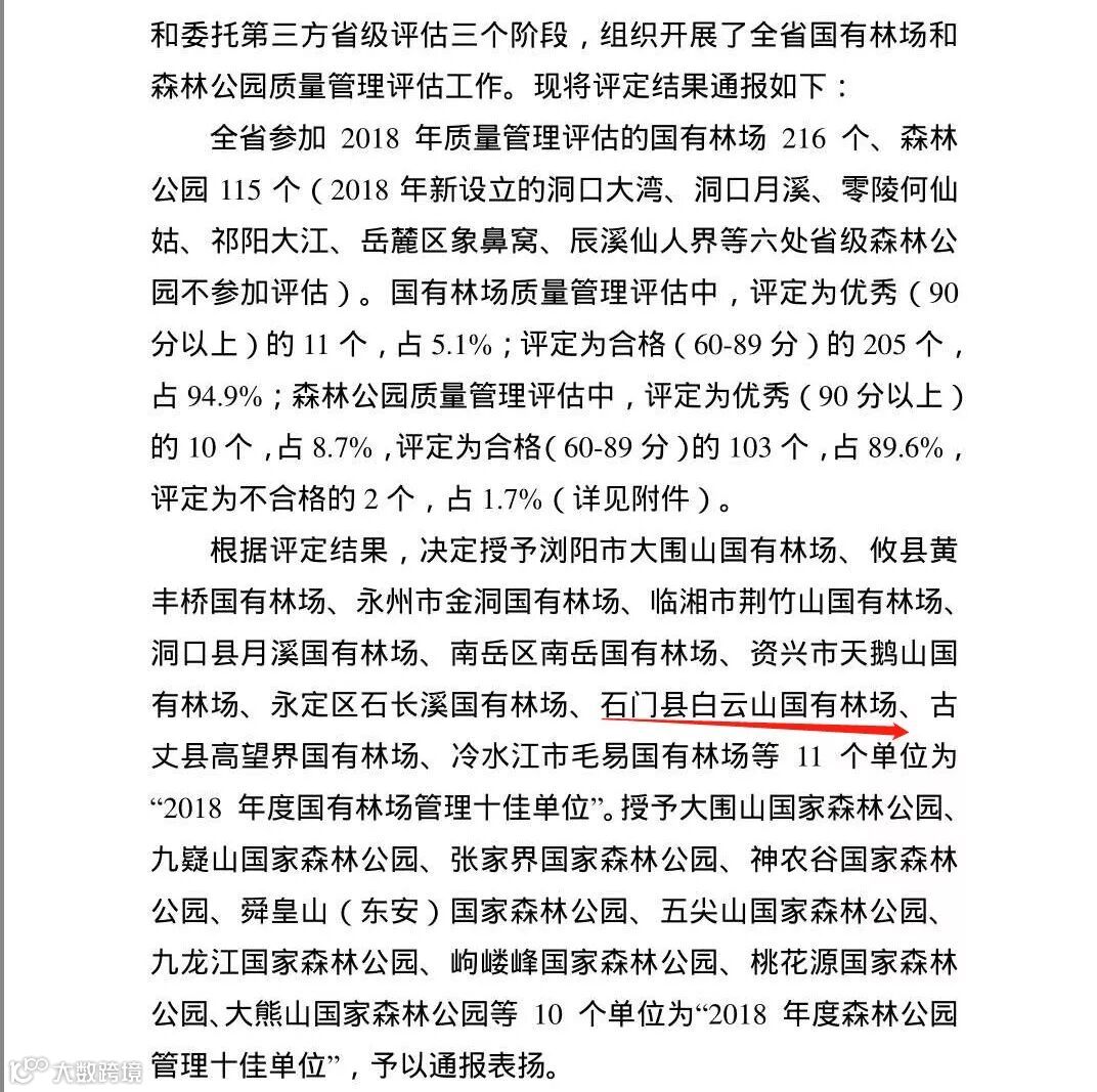 近日,《湖南省林业局关于2018年全省国有林场和森林公园质量管理评估结果的通报》发布,石门白云山国有林场在全省216个国有林场质量管理评估中脱颖而出,通过林场自评、市州评价和委托第三方省级评价三个阶段,获“2018年度国有林场管理十佳单位”称号。
