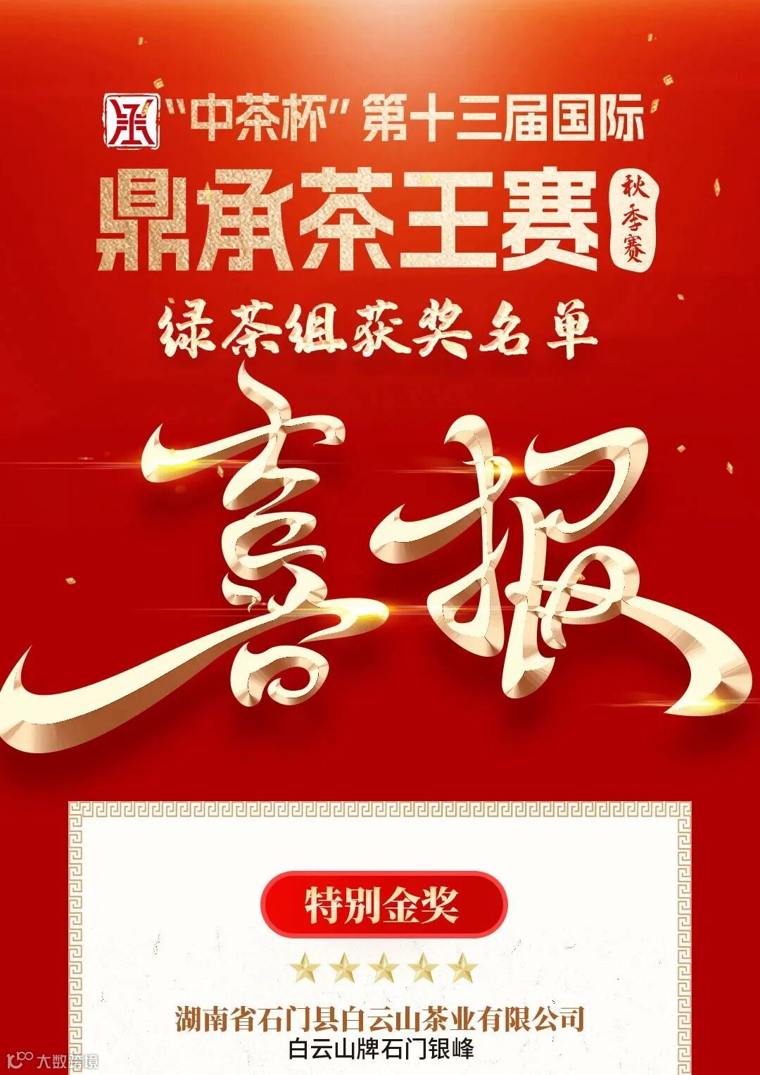 今天(12月14日),“中茶杯”第十三届国际鼎承茶王赛 · 秋季赛获奖名单新鲜出炉,白云山茶业有限公司选送的“白云山”牌石门银峰获得大赛绿茶组“特别金奖”!