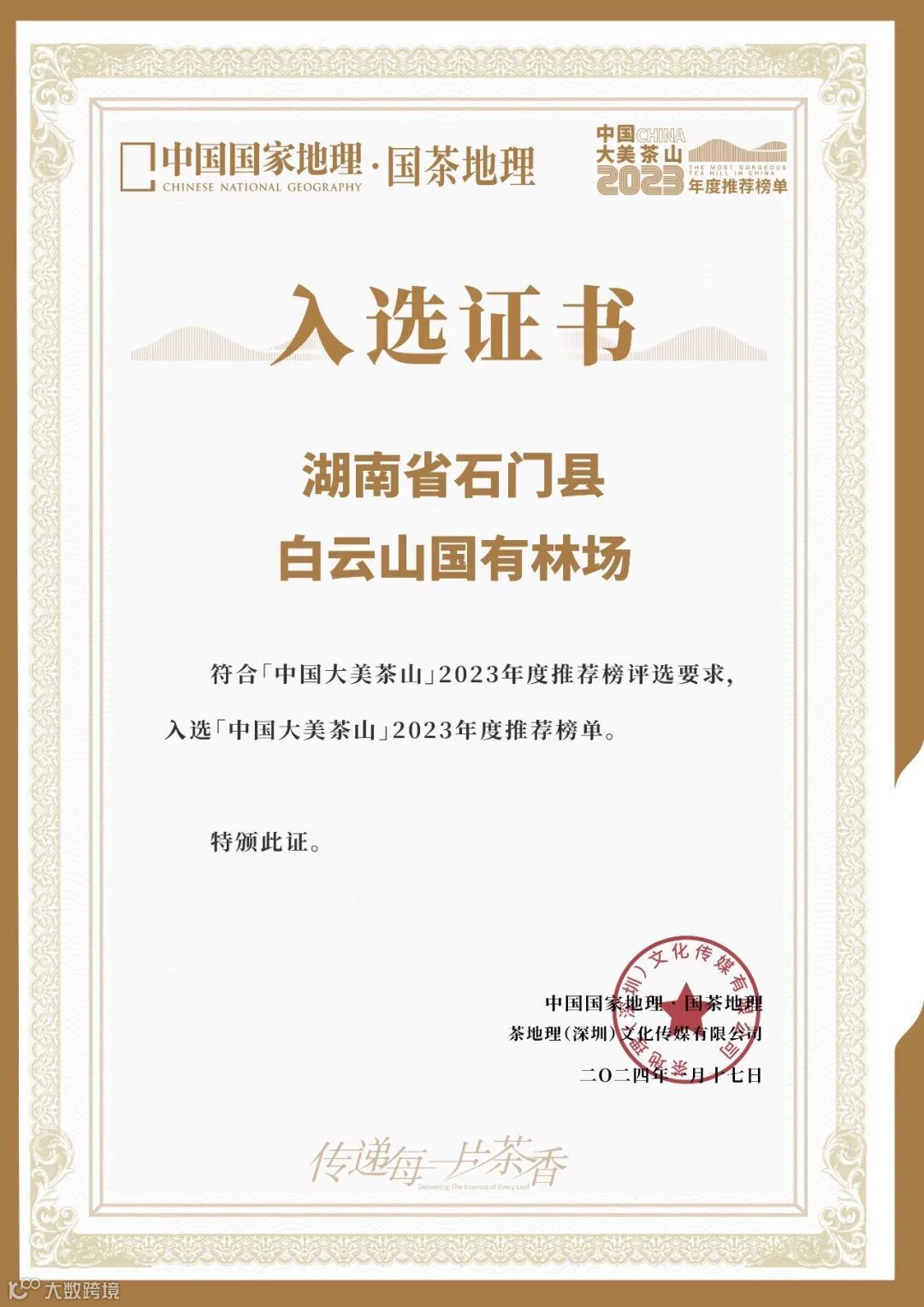 9月27日,2024第三届宝船国际茶文化节(以下简称“宝船节”)在香港会议展览中心隆重开幕。会议期间,湖南省石门县白云山国有林场作为2023-2024年度全国首批30座入选茶山,现场颁发了入榜证书。白云山也成为人们四季打卡胜地,正在建设中的云山茶海景区即将以崭新的面貌迎接四方宾客。