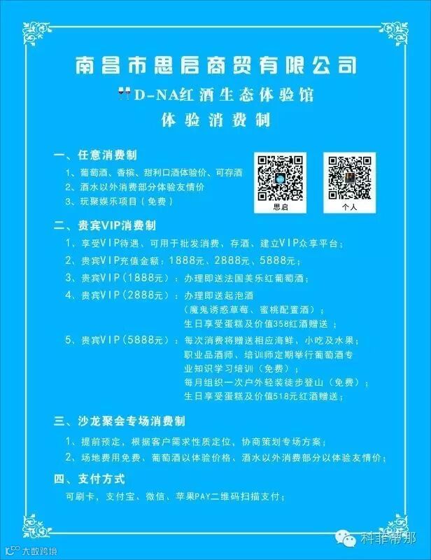 科菲蒂那葡萄酒连锁体系—南昌市思启商贸有限公司D—NA红酒生态体验馆近日推出全新体验消费制,欢迎各位新老各户前往消费体验,并不吝给予宝贵的支持和建议!