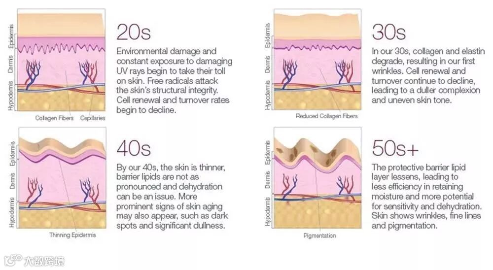 1、 颜色和质地的改变:年轻的肌肤水润白滑,而随年龄增长,紧致的皮肤会逐渐变得干燥、毛孔明显、颜色暗沉而粗糙。同时,皮肤也变得更敏感。