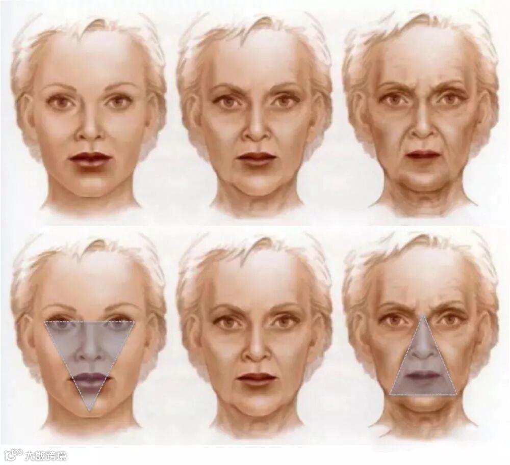 大体外观上,年轻人面部饱满、圆润,轮廓线条清晰、上扬,形成面部倒立的“青春三角(triangle of youth)”。而随着年龄增加,颜面部皱纹、软组织下垂日渐明显,“青春三角”也逐步发生倒置,变为正立的三角形,容颜老态显现。