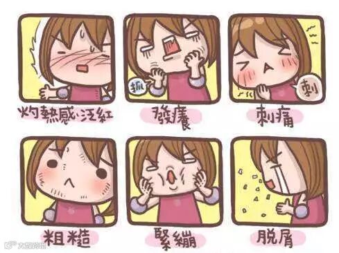 受到物理、化学、精神等因素刺激时皮肤易出现灼热、刺痛、瘙痒及紧绷等主观症状,伴或不伴红斑、鳞屑、毛细血管扩张等客观体征。