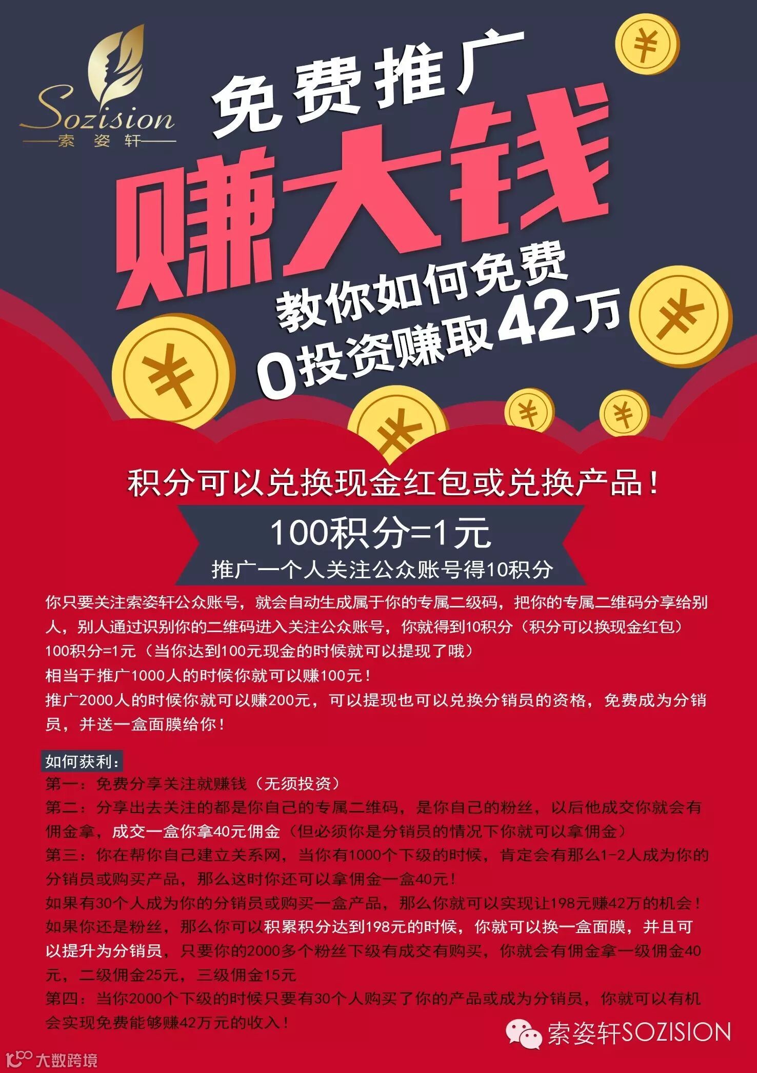 导读:推广可以赚积分,积分可以兑换现金红包或兑换产品!推广规则 推广可以赚积分,积分可以兑换现金红包或兑换产品!