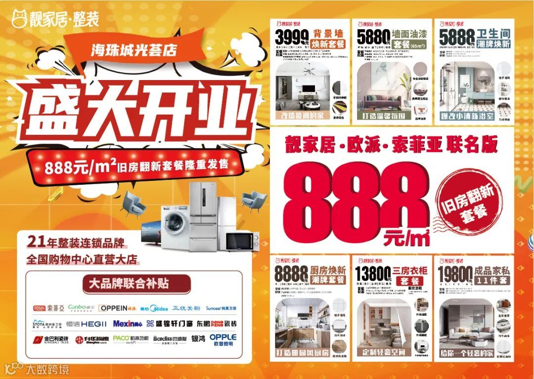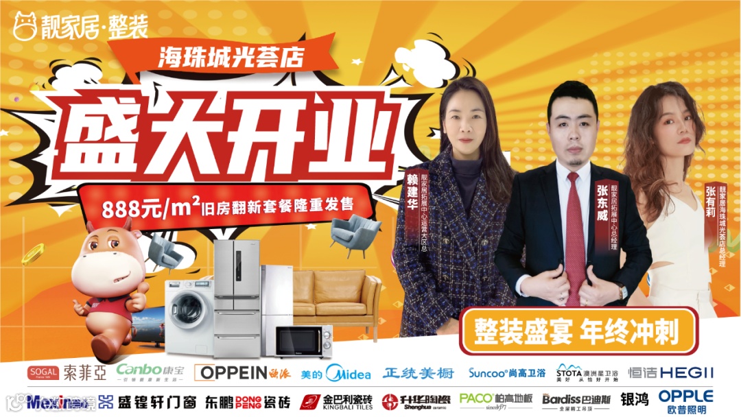 靓家居海珠城光荟店盛大开业!带给广州的新老业主超级优惠的装修套餐!不仅可以选购全屋建材产品,还有整家定制,成品家私,全屋智能家电等等,都是大品牌!满足新房装修,旧房翻新,局部翻新,精装房拎包住!