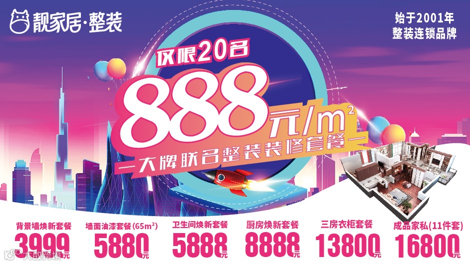 靓家居始创于2001年,专注整装服务,不断深耕装修行业,挖掘装修的痛点,致力于打造更省心、更省力、更省钱的装修,为每一位消费者提供最贴心的整装服务。