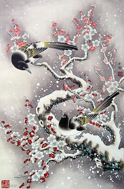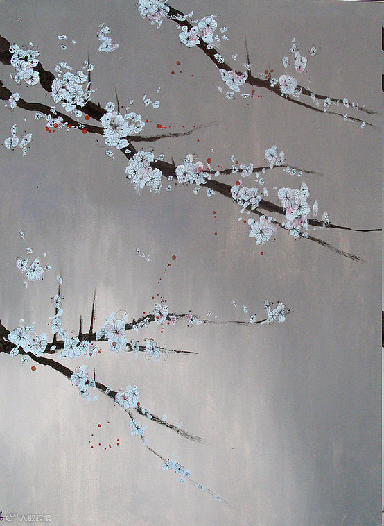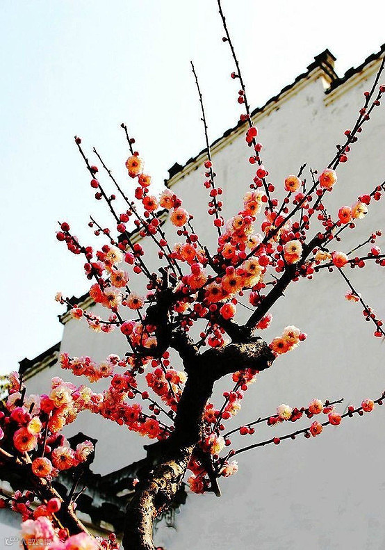 【梅】 老干虬出雕风寒,早讯春温绽花鲜。梅萼有格自风骨,绿意不扶亦卓妍。