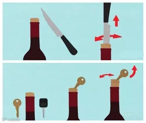 红酒塞完全陷在酒瓶里,想抠都没个地方可以下手抠酒塞。不急,眼前好酒可能只有一瓶,开瓶的方式却是各式各样。钥匙可以开瓶,锯齿刀也可以开瓶!