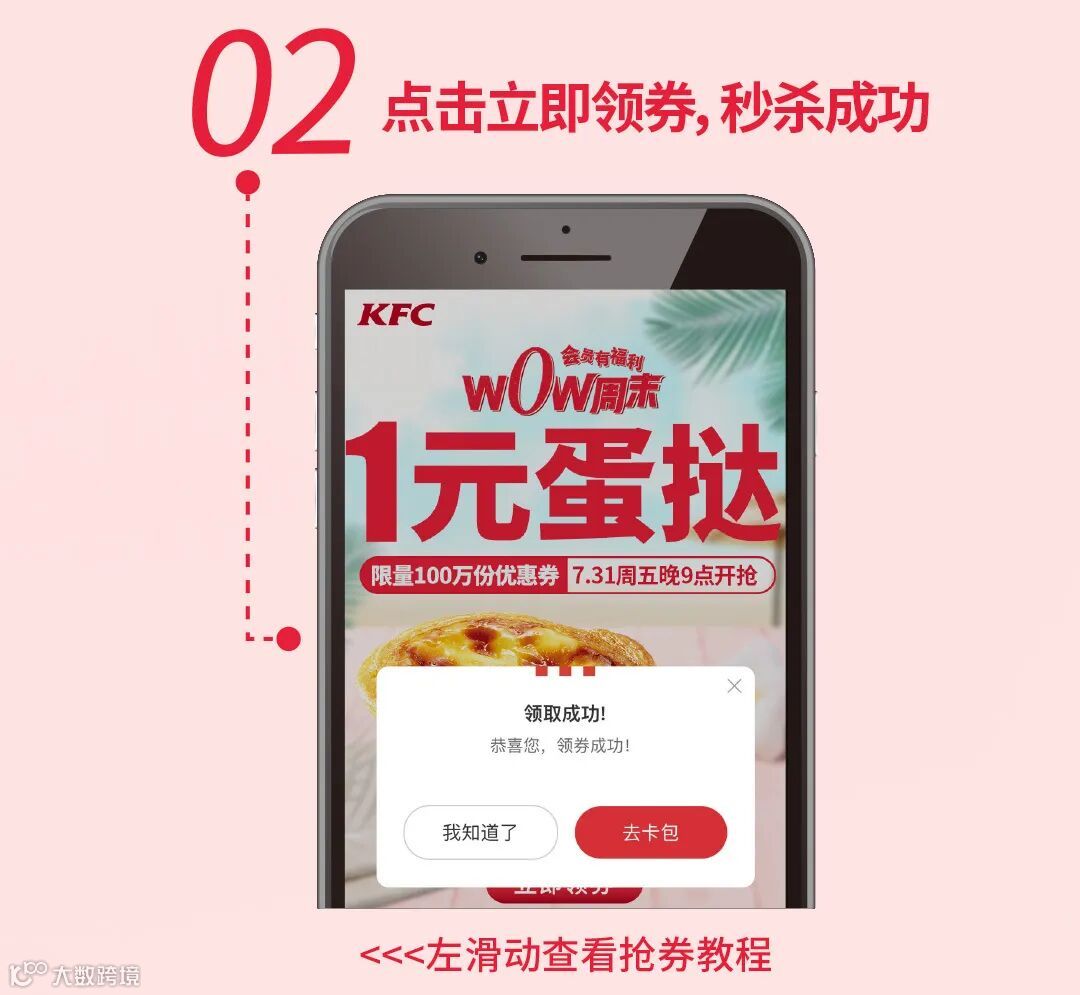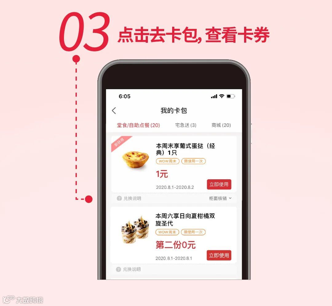 2020年8月1日-2020年8月2日、2020年8月8日-2020年8月9日,肯德基WOW会员可在“我的卡包”查看“本周六享吮指原味鸡第二份0元”,“本周日享吮指原味鸡第二份0元”,“本周六享西柚莫吉托鸡尾酒/无酒精第二份0元”,“本周日享西柚莫吉托鸡尾酒/无酒精第二份0元”,“本周六享日向夏柑橘双旋圣代第二份0元”,“本周日享日向夏柑橘双旋圣代第二份0元”,“本周六享夏日消薯桶第二份0元”,“本周日享夏日消薯桶第二份0元”优惠券各1张。每张优惠券的使用有效期详见各自的券说明。活动期间9:30-23:00,广东省、福建省、海南省、广西壮族自治区等部分地区仅限10:30-23:00供应,具体以餐厅实际营业时间为准。会员凭相应优惠券到店或手机自助点餐时,以单品价点购吮指原味鸡1块,可享同款产品第二份0元优惠;在不售卖吮指原味鸡的餐厅,吮指原味鸡将替换为黄金脆皮鸡。以单品价点购粉椒西柚莫吉托(无酒精)1杯或粉椒西柚莫吉托(鸡尾酒)1杯,可享同款产品第二份0元优惠;以单品价点购日向夏柑橘双旋圣代1个,可享同款产品第二份0元优惠;点购夏日消薯桶1份,可享同款产品第二份0元优惠。夏日消薯桶包含:薯条(大)1份+热辣香骨鸡3块+红豆派1个+劲爆鸡米花(小)1份。如遇吮指原味鸡或黄金脆皮鸡售罄,凭相应优惠券以单品价点购香辣黄金鸡柳4条,可享同款产品第二份0元优惠;粉椒西柚莫吉托(无酒精)、粉椒西柚莫吉托(鸡尾酒)(酒精度:约1%vol)自2020年7月20日上市,全国共限量800万杯,售完即止。未成年人及孕妇请勿饮酒。过度饮酒有害健康。如遇粉椒西柚莫吉托(无酒精)、粉椒西柚莫吉托(鸡尾酒)售罄,凭相应优惠券以单品价点购恋桃乌龙茶(冷)1杯,可享同款产品第二份0元优惠;日向夏柑橘冰淇淋系列产品自2020年6月29日起,在全国除浙江省、黑龙江省、内蒙古自治区呼伦贝尔市、满洲里市及扎兰屯市以外的地区上市,自2020年7月6日起,在浙江省、黑龙江省、内蒙古自治区呼伦贝尔市、满洲里市及扎兰屯市上市,日向夏柑橘双旋圣代限量80万个,售完即止。日向夏柑橘冰淇淋系列产品使用的日向夏柑橘汁中所使用的日向夏柑橘,原产地为日本宫崎县。ひゅう が なつ为日语中的“日向夏”。日向夏为柑橘品种名,不作为商标使用。如遇日向夏柑橘双旋圣代售罄,凭相应优惠券以单品价点购原味圣代(冲绳黑糖珍珠酱)1个,可享同款产品第二份0元优惠;如遇红豆派售罄,凭券可将桶内的红豆派1个替换成葡式蛋挞(经典)1只;如遇薯条(大)售罄,凭券可将桶内的薯条(大)1份替换成黄金鸡块5块。活动仅限开通WOW会员积分兑礼且有此产品供应的肯德基餐厅,交通枢纽、旅游景区的餐厅及精选餐厅等部分餐厅不参加此活动,具体情况以餐厅公示为准。活动期间,每个会员ID每张优惠券仅限收到1次,每张优惠券仅限使用1次,核销后即失效。券使用规则详见“我的卡包”券说明。不适用于肯德基宅急送。不与其他优惠共享。产品及包装以实物为准。