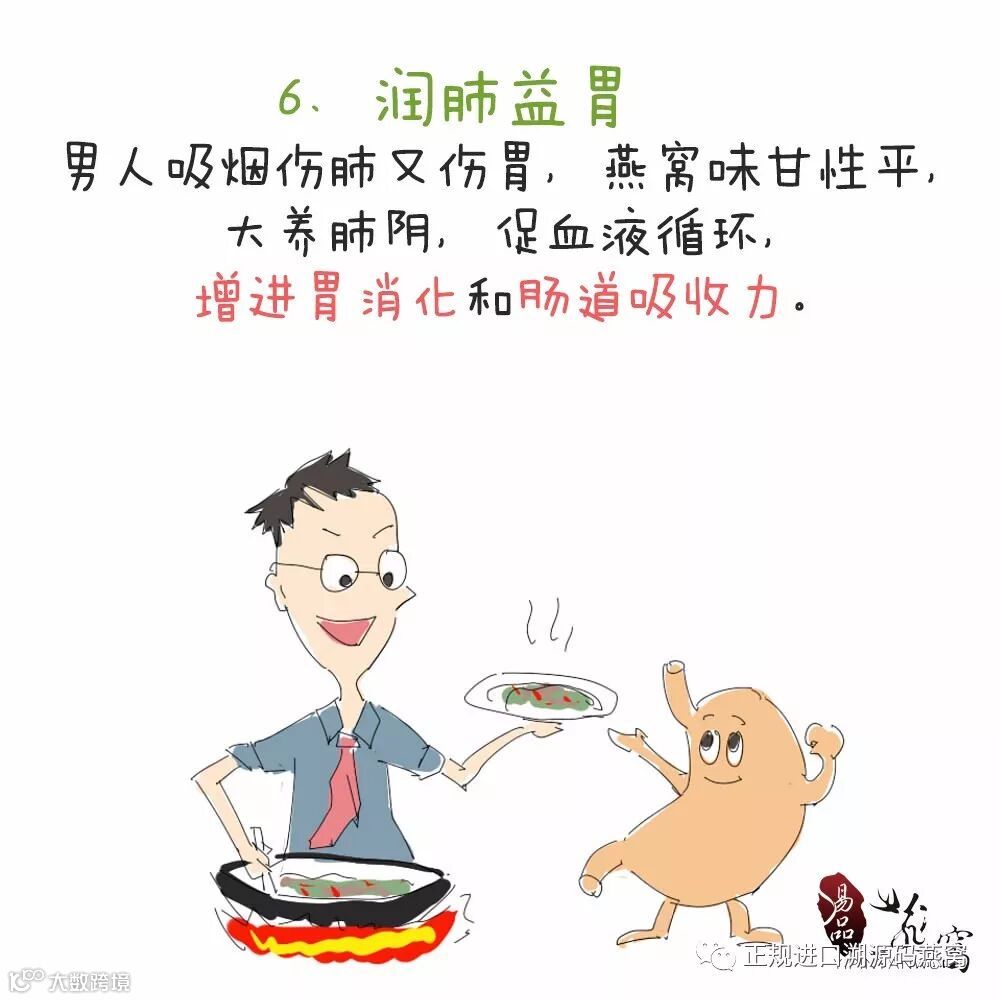 首先从古至今,各种医籍无不强调燕窝对呼吸系统(古时称为肺系)疾病的治疗作用,对于有吸烟的不良嗜好的人来说,燕窝是不可多得的“洗肺”佳品。在中国曾有学者指出,用燕窝为主要药物制成的复方燕窝汤,治疗了五百余位慢性支气管炎病人,取得了非常显著的临床疗效。也进一步验证了古书中对燕窝疗效的描述。