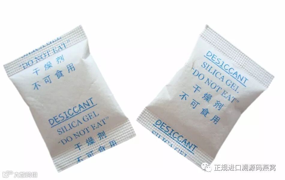或许有人担心,放在外面,会不会潮呢?重点来了,小易给你出小妙招了!我们在每盒燕窝里放在如下图所示的食品干燥剂,它属于硅胶干燥剂,最大的作用就是吸收水分,所以如果每一百克燕窝里放上一袋这样的小东东,你就不用愁了!