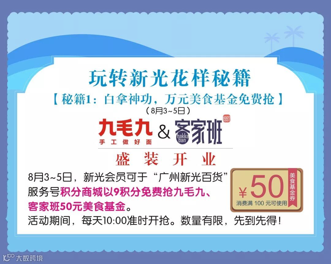 号外号外!超人气餐馆九毛九已正式开业,时尚派的代表客家班也在随时待命中,8月3-5日,万元美食基金免费抢!新光助你大吃特吃!