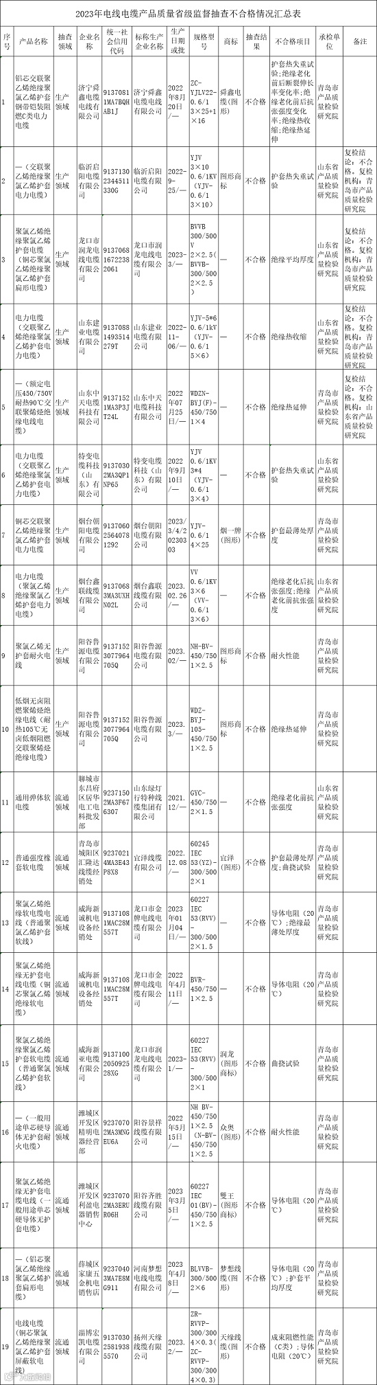 不合格产品生产企业为淄博宏凯电缆有限公司、青岛市城阳区汇隆达线缆经销处、薛城区家康五金机电销售店、威海新亚电缆有限公司、威海新诚机电设备经销处、潍城区开发区精明电器经营部、潍城区开发区利盈电器销售中心、聊城市东昌府区居华电工电料批发部8家销售者和特变电缆科技(山东)有限公司、烟台朝阳电缆有限公司、龙口市润龙电线电缆有限公司、烟台鑫联线缆有限公司、济宁舜鑫电缆电线有限公司、临沂启阳电缆有限公司、阳谷鲁源电缆有限公司、山东中天电缆科技有限公司、山东建业电缆有限公司。