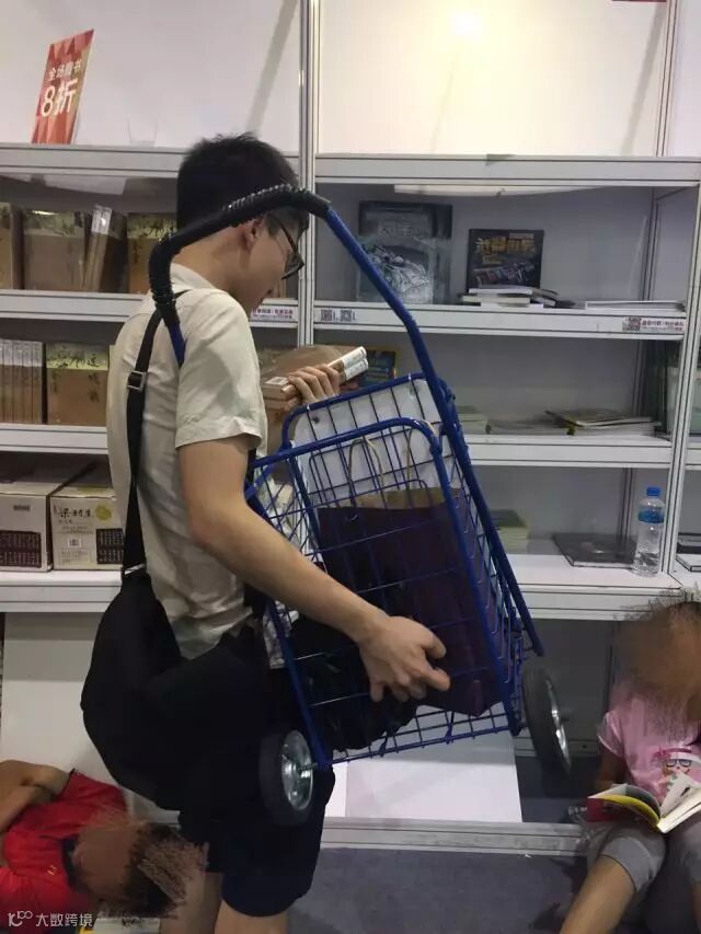 某日去书展借了辆可爱的小推车,嘱咐小猪军一定要好好牵着,不然50块押金就泡汤了。后来他说路上好多人,各种躺着坐着,拉车不方便,于是他单手把小推车车抱起来了。不如我给你个购物袋吧???