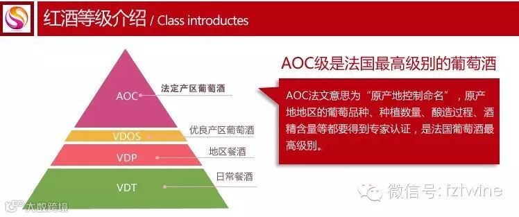 ① 法定产区葡萄酒(AOC),原产地控制命名,只能用原产地种植的葡萄酿制,不可勾兑别地葡萄汁,占比为35%,酒标为Appellation+产地名+Cotrolee .