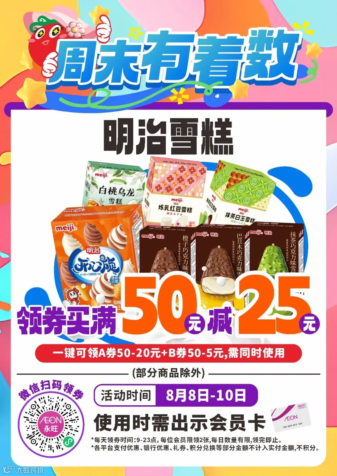 8月8-10日每天9-23点,领券购买明治雪糕满50减25元,葡萄满30减5元。部分商品除外,券量有限,先到先得。