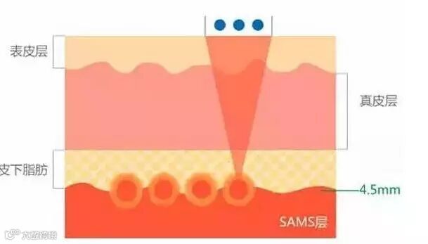 超声刀就是利用声波高能聚焦,将能量聚焦在一个点上,迅速穿透表皮层,脂肪层、筋膜层,在筋膜层形成网状凝结点,刺激组织收缩紧致,激发胶原蛋白生长,达到提升除皱的效果。