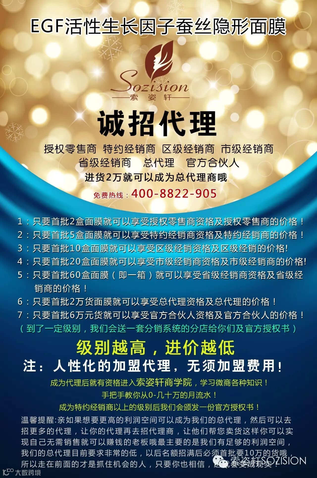 1:只要拿货2盒面膜就可以享受授权零售商资格及授权零售商的价格!(具体价格可以查看代理价格表格)