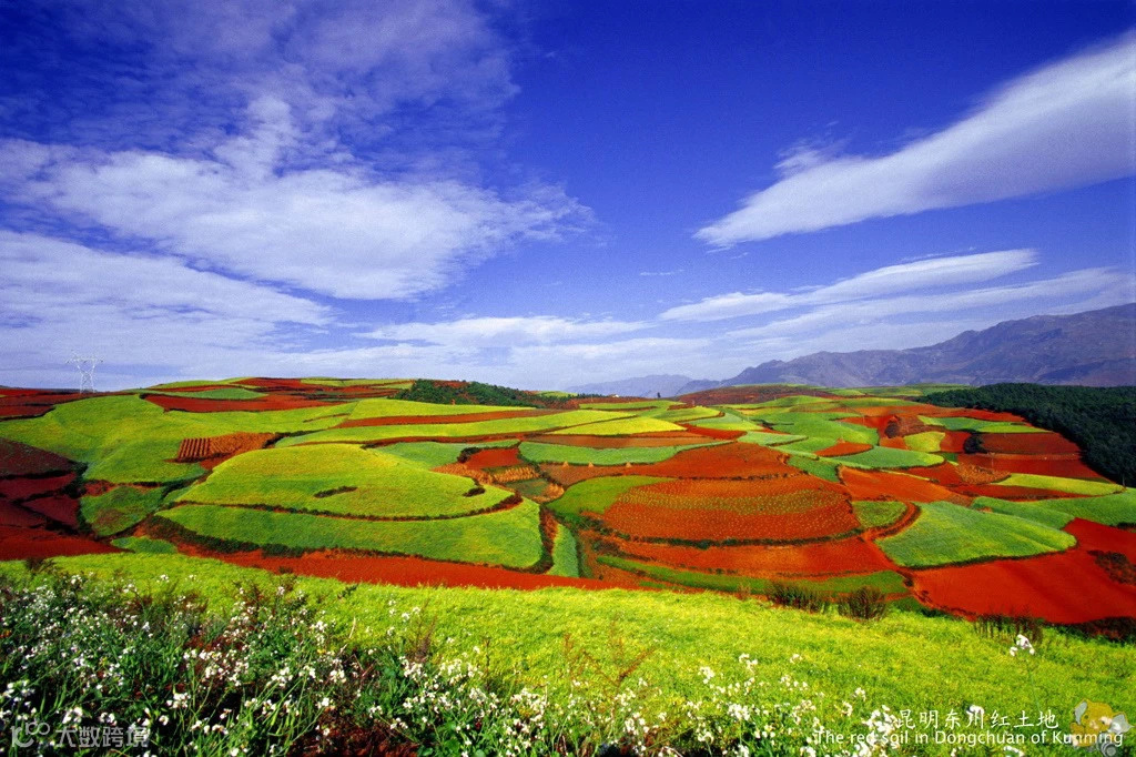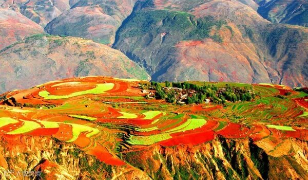 火红的泥土、变色的植物,各异的形状、优美的线条,衬以蓝天、白云和那变幻莫测的光线,东川红土地就是一副绚烂的变色油画!尤其是每年9月,这方土地点缀着各种成熟的作物,五彩斑斓,若再笼罩上一层薄薄的雾气,更是仙境一般。