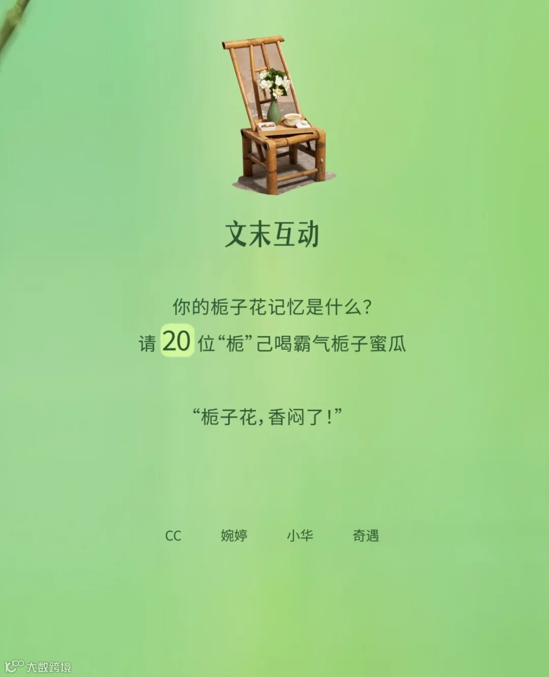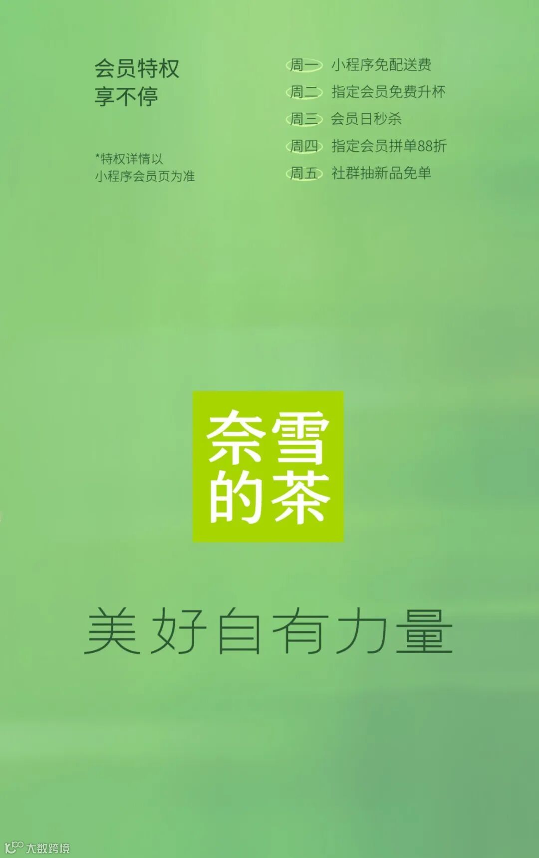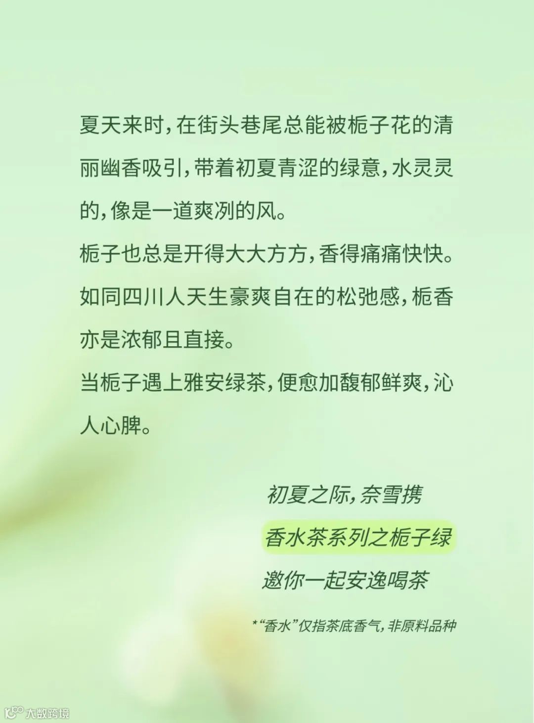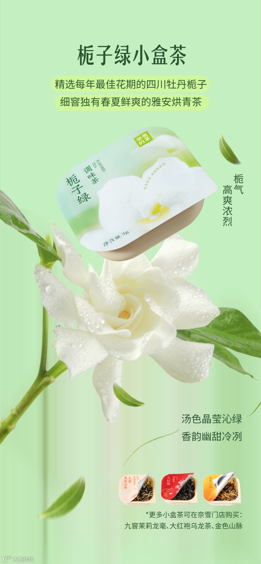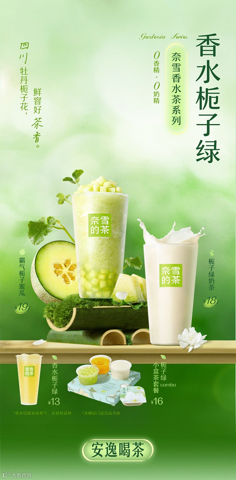 原来是栀子花呀 夏天来时,在街头巷尾总能被栀子花的清丽幽香吸引,带着初夏青涩的绿意,水灵灵的,像是一道爽冽的风。栀子也总是开得大大方方,香得痛痛快快。如同四川人天生豪爽自在的松弛感,栀香亦是浓郁且直接。当栀子遇上雅安绿茶,便愈加馥郁鲜爽,沁人心脾。初夏之际,奈雪携 夏日香水茶系列之栀子绿 邀你一起安逸喝茶 *“香水”仅指茶底香气,非原料品种 花香茶骨,鲜灵清扬 0香精 四川雅安烘青绿茶 层层叠叠浸染 积蓄饱满栀香 反复多次,只待花香融入茶骨 藏下栀子的鲜灵清扬 不见花影,但闻栀香 冲泡顷刻,花香释放 犹如在杯中重开了一次 带着初夏清透的绿意 幽甜鲜爽 钻进鼻尖,滑进喉间 栀子绿combo 一茶三喝 饮茶新体验 香水栀子绿:栀香高爽幽甜 霸气栀子蜜瓜:瓜肉甜蜜,栀香鲜爽 栀子绿奶茶:甘醇奶香融合清冷茶韵 栀子绿小盒茶 精选每年最佳花期的四川牡丹栀子 栀气高爽浓烈 细窨独有春夏鲜爽的雅安烘青茶 汤色晶莹沁绿,香韵幽甜冷冽 *更多小盒茶可在奈雪门店购买:九窨茉莉龙毫、大红袍乌龙茶、金色山脉 霸气栀子蜜瓜 前调:蜜瓜甜润 中调:栀香浓郁 尾调:绿茶爽冽 优选山东网纹蜜瓜 果肉如翡翠般透蜜甜软 与沁雅清爽的栀子绿交织 猛吸一口 舌尖都裹上甜润的花果香 栀子绿奶茶 前调:栀香清灵纯净 中调:奶香饱满甜醇 后调:绿茶悠然清逸 香醇牛奶与栀子绿碰撞交融 温润化开栀子绿的清冷 更添一份柔和细腻 口感也丰厚饱满起来 栀子绿combo小盒茶套餐 16元 一茶四喝 一次品尽栀子绿的四种喝茶 买栀子绿combo小盒茶套餐 得1盒小盒茶 数量有限,赠完即止 限量售卖,限到店堂食,全国大陆门店参与 去班味口令 瓜分红包 2024年6月12日—6月16日 每天15:00 小程序会员参与口令答题 50000份买一送一券等你来抢 文末互动 你的栀子花记忆是什么?请 20 位“栀己”喝霸气栀子蜜瓜