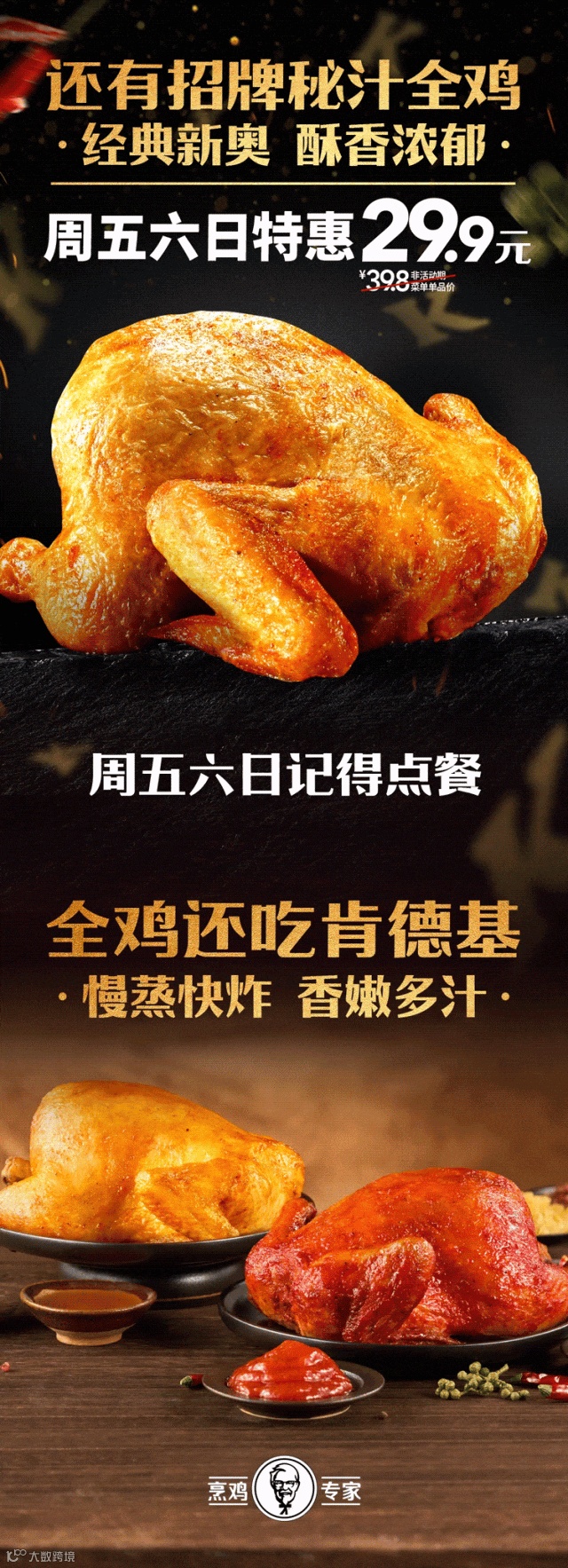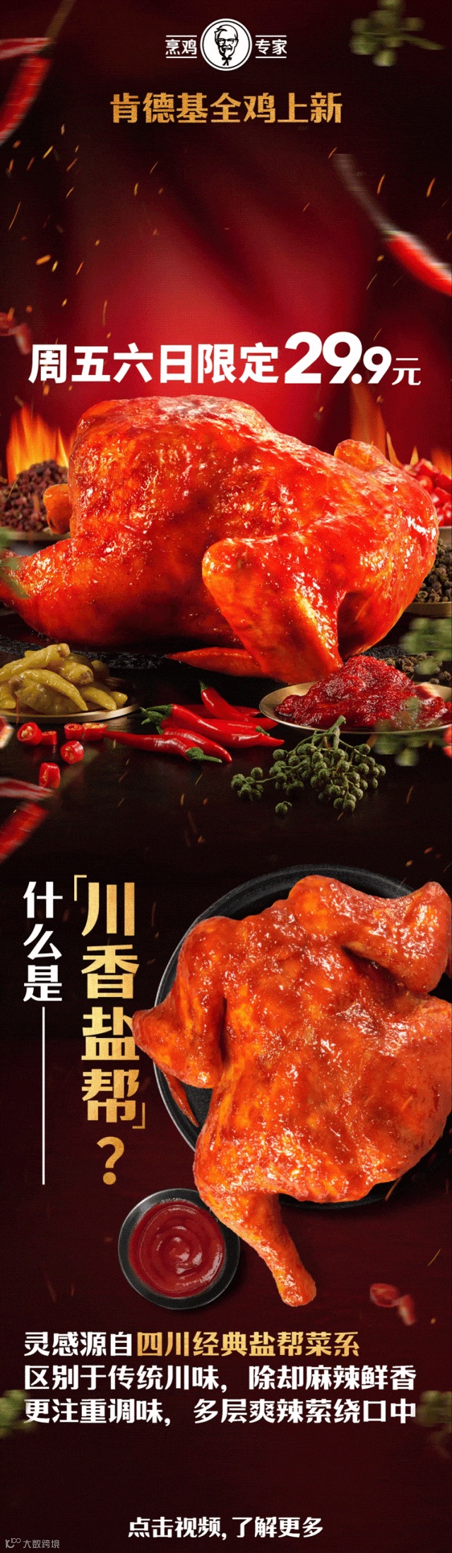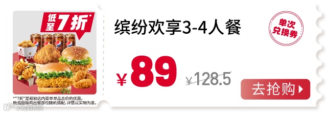 堂食具体供应时间以餐厅实际营业时间为准,仅限有此产品供应的部分肯德基餐厅参与此活动,交通枢纽、旅游景区、西藏自治区的餐厅及精选餐厅等部分餐厅除外,具体情况以餐厅餐牌公示为准;外送部分送餐区域不供应此产品,详情以输入地址后显示的菜单及送餐时间为准。除推广产品外,其他物品仅做装饰目的,或仅为原料或风味展示,图示内容仅供参考。产品、周边、玩具及包装以实物为准。不与其他优惠共享。全鸡产品是指去内脏、去头、去颈、去爪、去尾的全鸡。