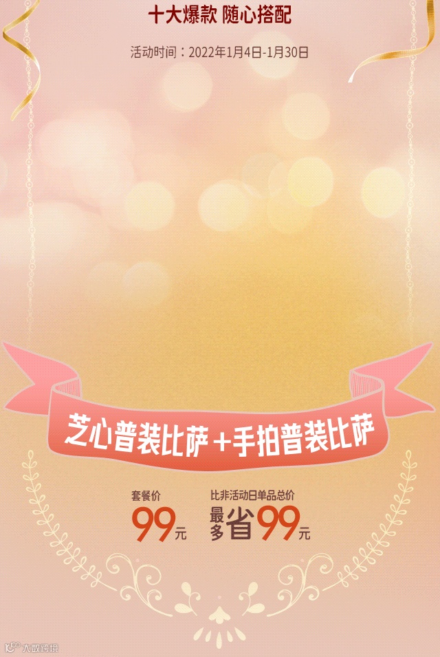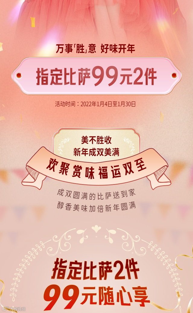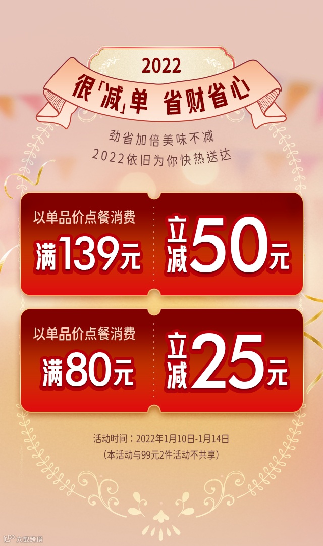 2022年1月4日至2022年1月30日,通过必胜客宅急送官方网络订餐,即可享99元比萨2件 (芝心普装和手拍普装),内含:(1)以下芝心普装比萨任选一份:金枕榴莲多多比萨、乳酪大会比萨、主厨葡式咖喱鸡肉比萨、烤肠派对比萨、榴莲菠菠块块果肉比萨、硬核肉多多比萨、鮮香麻辣牛上脑比萨、甄品现烤牛上脑比萨、超级至尊比萨、劲爆鸡米花比萨;(2)以下手拍普装比萨任选一份:金枕榴莲多多比萨、乳酪大会比萨、主厨葡式咖喱鸡肉比萨、烤肠派对比萨、榴莲菠菠块块果肉比萨、硬核肉多多比萨、鲜香麻辣牛上脑比萨、甄品现烤牛上脑比2022年1月10日至2022年1月14日,在必胜客宅急送官方网络订餐,活动期间以单品价选购渠道内菜单餐品且单笔实付金额满139元,可减50元优惠;活动期间以单品价选购渠道内菜单餐品且单笔实付金额满80元,可减25元优惠。本优惠活动不与其他优惠同享且菜单中套餐及“必胜优选类别”产品不参与此活动。萨、超級至尊比萨、劲爆鸡米花比萨。