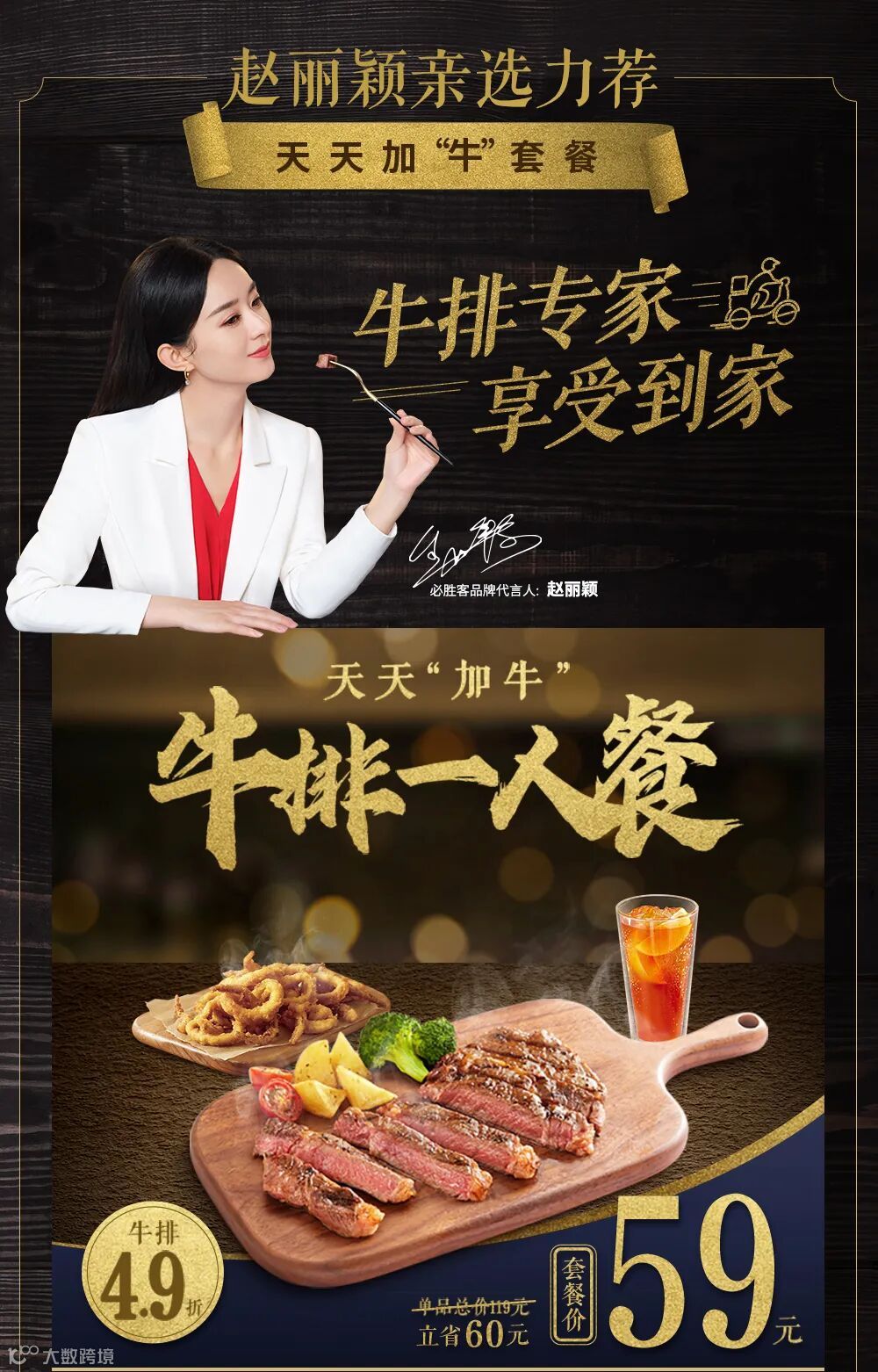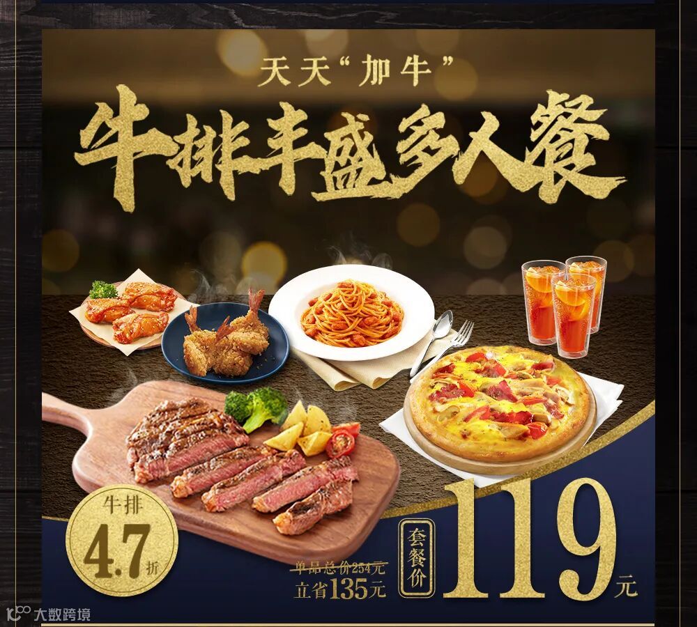 2020年06月08日-07月26日,在必胜客宅急送官方渠道订餐,可点购天天“加牛”牛排套餐。天天“加牛”牛排1人餐,内含澳洲西冷牛排1份+酥炸鱿鱼小份+冰柠檬红茶1杯,单品总价119元,套餐价59元。天天“加牛”牛排丰盛多人餐,内含澳洲西冷牛排1份+意式肉酱面1份+新奥尔良风情烤肉比萨铁盘个人装1份+蜜汁焦香伴翅3只装+香草凤尾虾3只+冰柠檬红茶3杯,单品总价254元,套餐价119元。必胜客牛排系列产品所使用的原料肉为进口的整块牛肉,在国内采用现代工艺进行了精心调制。牛肉原料产地因批次不同而有所差异,请以餐厅实际供应为准。