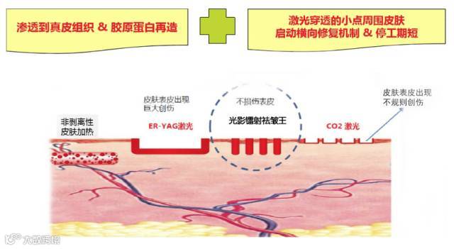 功效:通过激光打进皮肤胶原蛋白层,激活细胞新生,促进胶原蛋白层加厚,让肌肤紧致饱满,抚平皱纹。