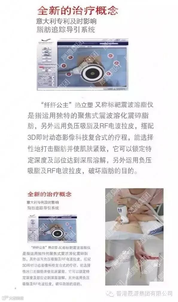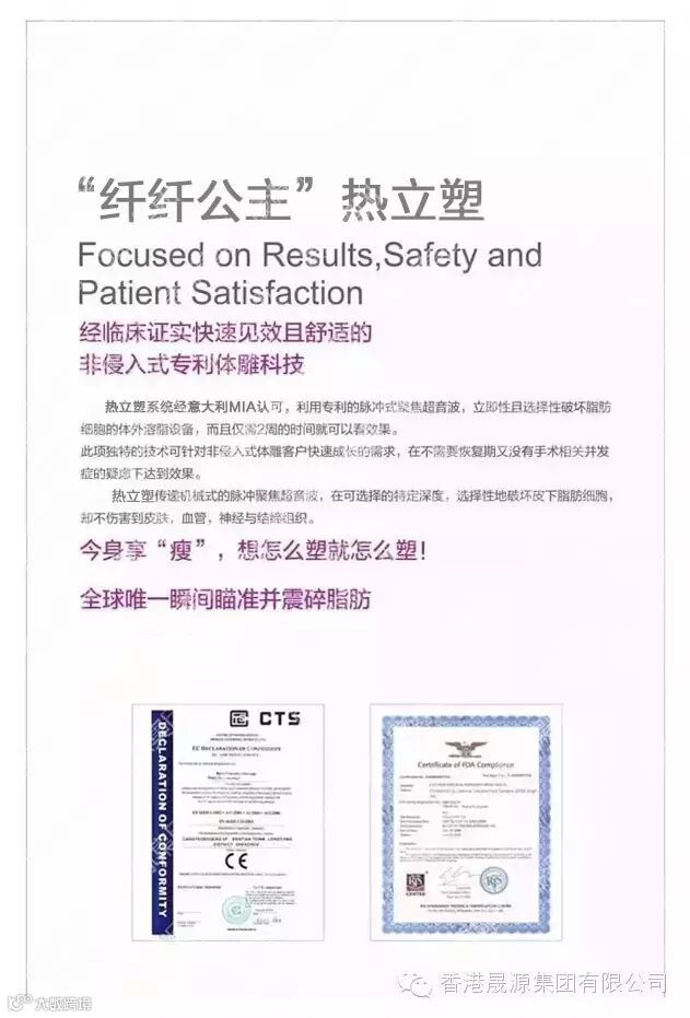 由聚焦超音波所产生的震波能量,能在可控制的深度范围内,瞄准并震碎脂肪细胞,在“纤纤公主”热立塑过去曾被发表的学术研究文献中也证实,根据治疗原理,能够立即破坏脂肪细胞,而完全不损害血管、神经与结缔组织。