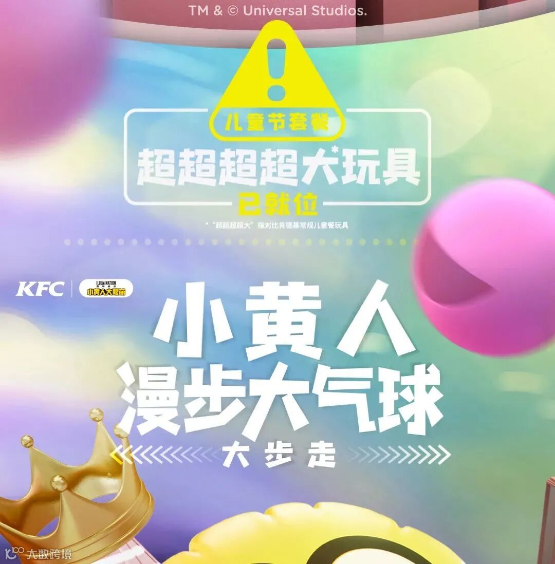 儿童节套餐自2021年5月22日起上市,买儿童节套餐含小黄人超大玩具一个。“超大”指对比肯德基常规儿童系列玩具。玩具共4款,当日款式以餐厅实际供应为准。套餐全国限量总计292万份,售完即止。仅限9:30-23:00供应,广东省、福建省、海南省、广西壮族自治区等部分地区仅限10:30-23:00供应,具体以餐厅实际营业时间为准。交通枢纽、旅游景区的餐厅及精选餐厅等部分餐厅不参与此活动,具体情况以餐厅公示为准。不适用于肯德基宅急送。产品、玩具及包装以实物为准。本活动不可与其他优惠共享。