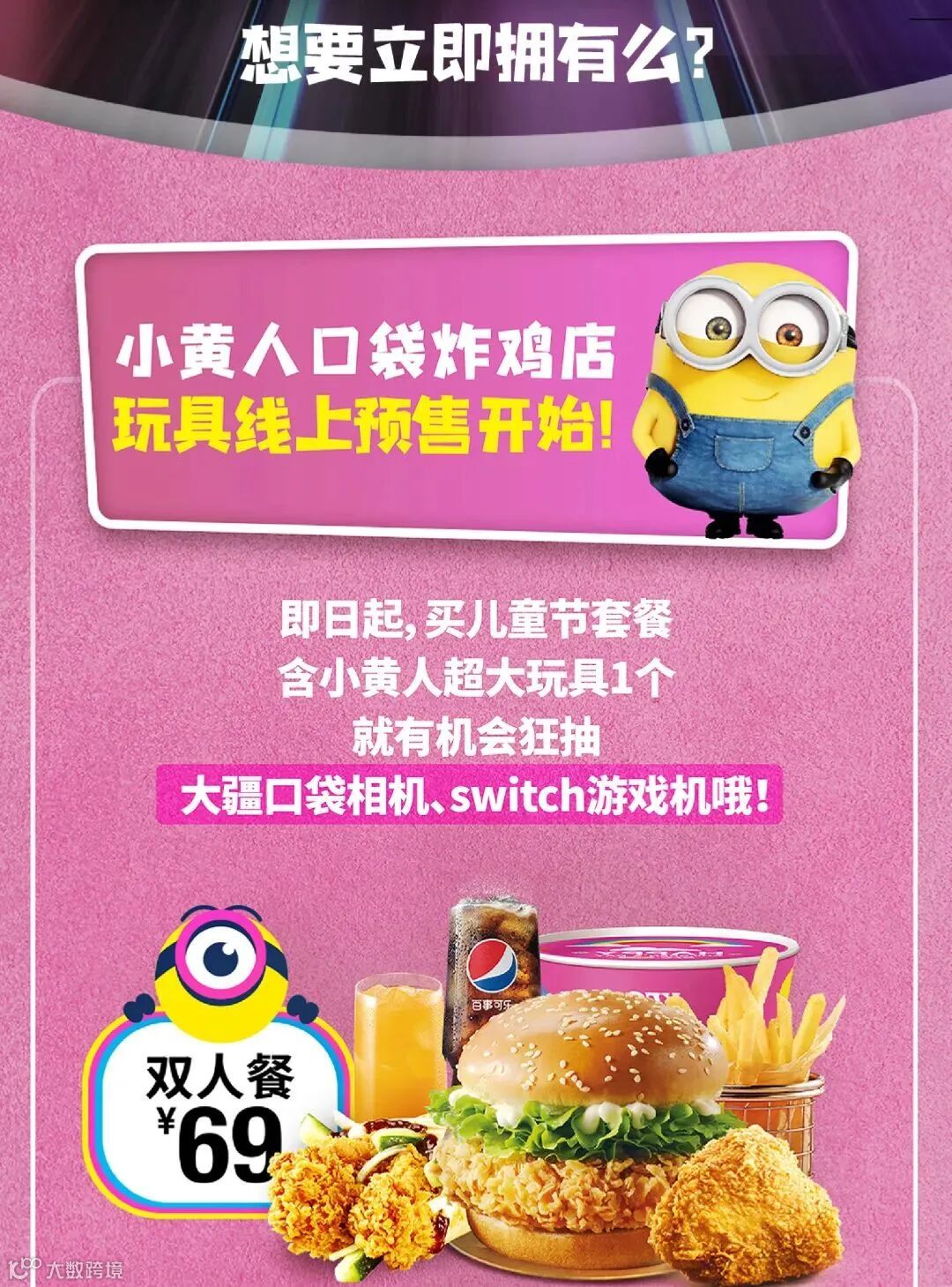 活动期间,进入【口袋炸鸡店】-【六一小黄人的炸鸡店】-【货架页面】,购买儿童节双人餐、儿童节家庭桶六一快乐小桶或六一快乐大桶电子美食券,并在2021年5月31日前核销,即视为参与活动,有机会获得大疆灵眸口袋云台相机1台或任天堂switch游戏机1台。