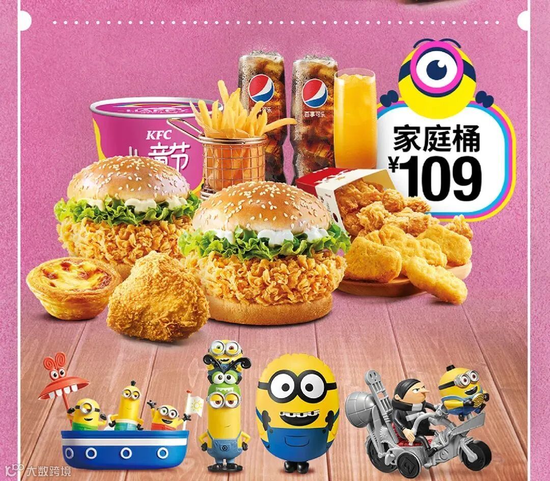 套餐内容:香辣鸡腿堡2个、老北京鸡肉卷1个、黄金鸡块5块、吮指原味鸡1块、葡式蛋挞(经典)1只、红豆派1个、薯条(小)1份、百事可乐(小)2杯、九珍果汁饮料1杯、小黄人大眼萌香蕉风味慕斯蛋糕1个、小黄人超大玩具1个(“超大”指对比肯德基常规儿童系列玩具),售价149元。