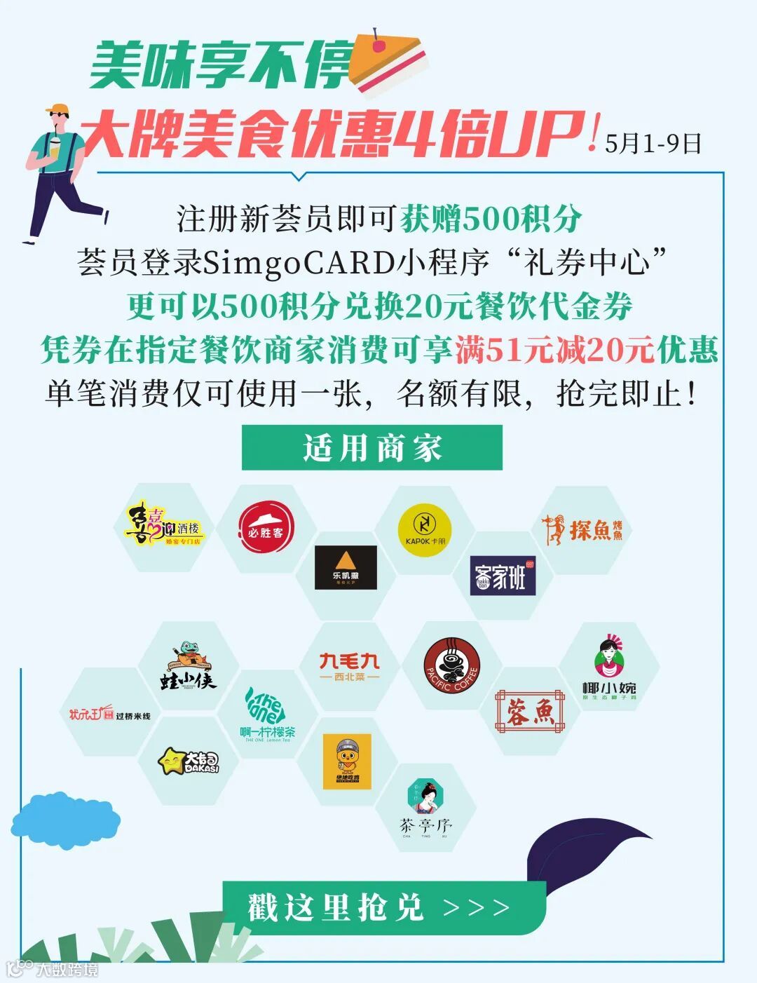 导读:折上90团100、500积分抢兑20元美食券,5.1假期疯狂来袭!