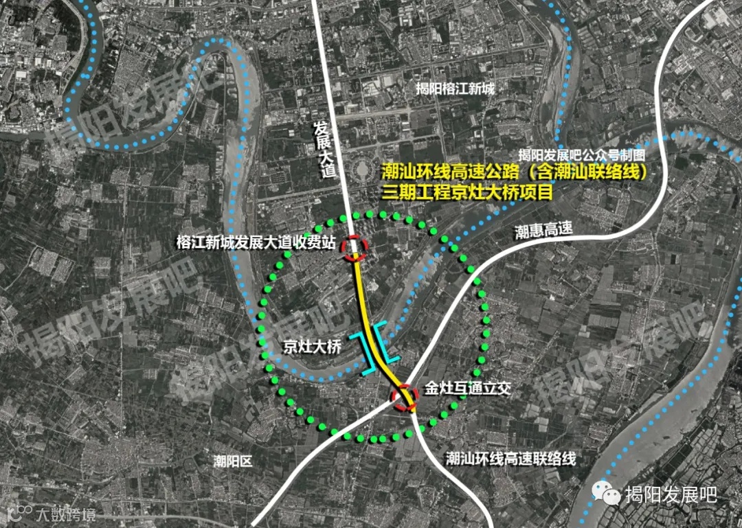 起点位于关埠镇欧厝村,顺接潮汕环线高速公路潮汕联络线,并与潮惠高速公路相交,设金灶(枢纽)互通立交,向北跨越榕江南河,终点位于揭阳市空港经济区京南村,顺接发展大道,全长约3.1公里,总投资22.9亿元。项目的建设对区域路网结构,适应汕揭通道未来发展具有重要意义。