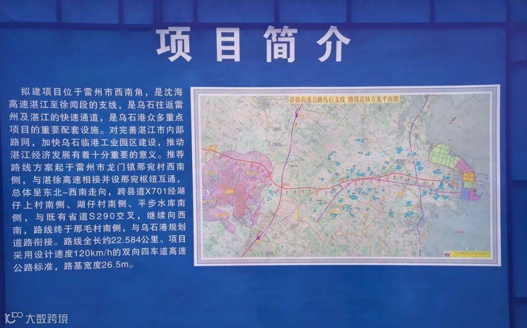 项目起于雷州市龙门镇,通过设置那宛枢纽互通与既有湛徐高速相接,总体呈东北-西南走向,途经覃斗镇、乌石镇,终点与乌石港规划道路衔接。项目拟采用高速公路技术标准,设计速度为120km/h;全线路基采用双向四车道,整体式路基标准横断面宽度26.5米。全长22.6公里,总投资19.2亿元。
