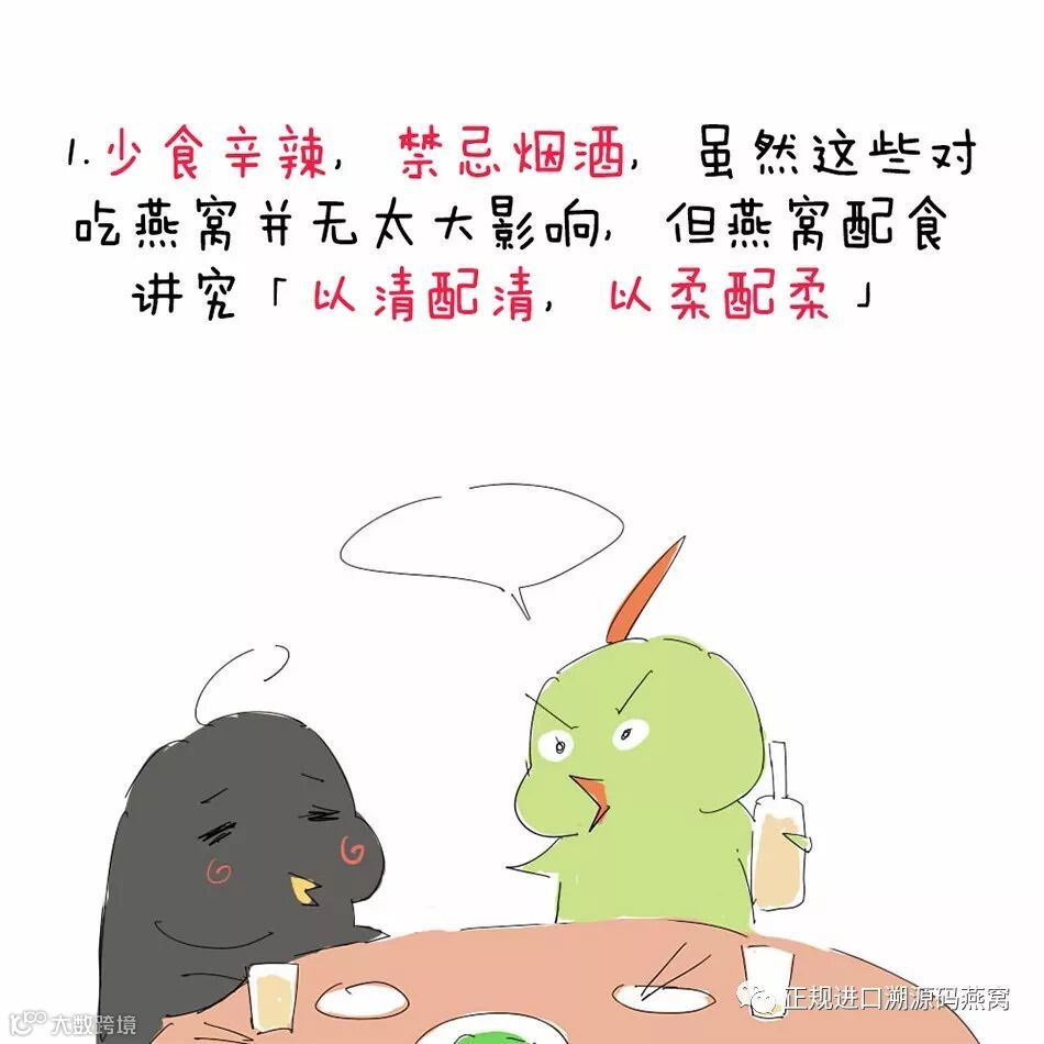 燕窝毕竟属于大补之物,进食时不宜辛辣,油腻,戒烟酒起燥之物。如果是感冒发烧期间可暂停一段时间,因为此时吸收能力较差,燕窝进补无法起到最佳进补效果。