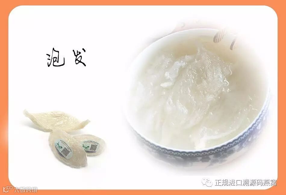 泡发又称浸发、发料。以水为助发溶剂,将干料浸至膨胀、松软、柔嫩后供正式烹调用。干货原料重新吸入水分后,能最大限度地恢复原有的鲜嫩、松软状态。根据季节他,一般夏季为常温,冬季为温水。燕窝加温水泡,再用纯净水漂洗两到三次(注意保持形态整齐),然后泡入凉水中,燕窝像生物一样,有老嫩之分,一般在3-5个小时。