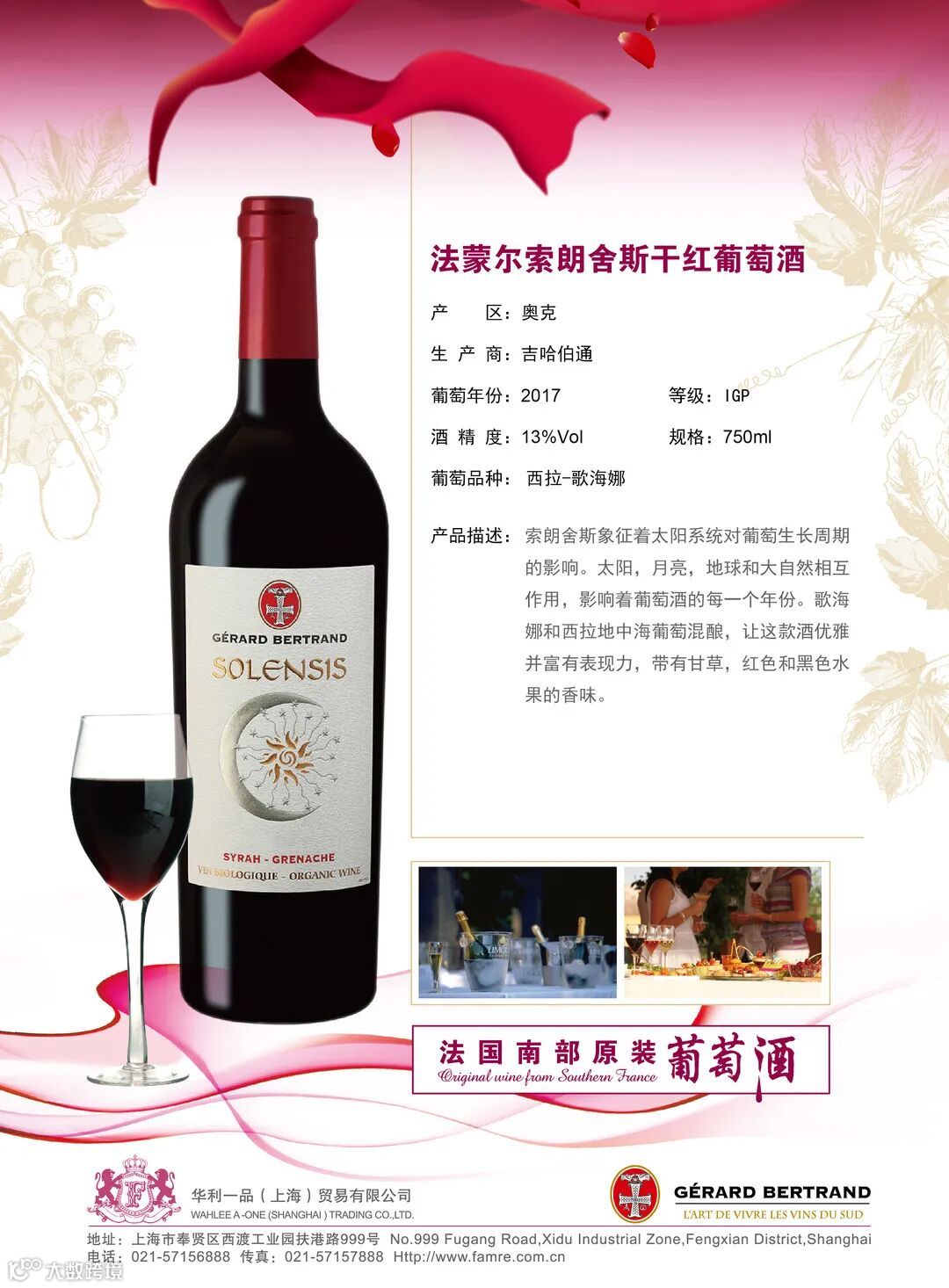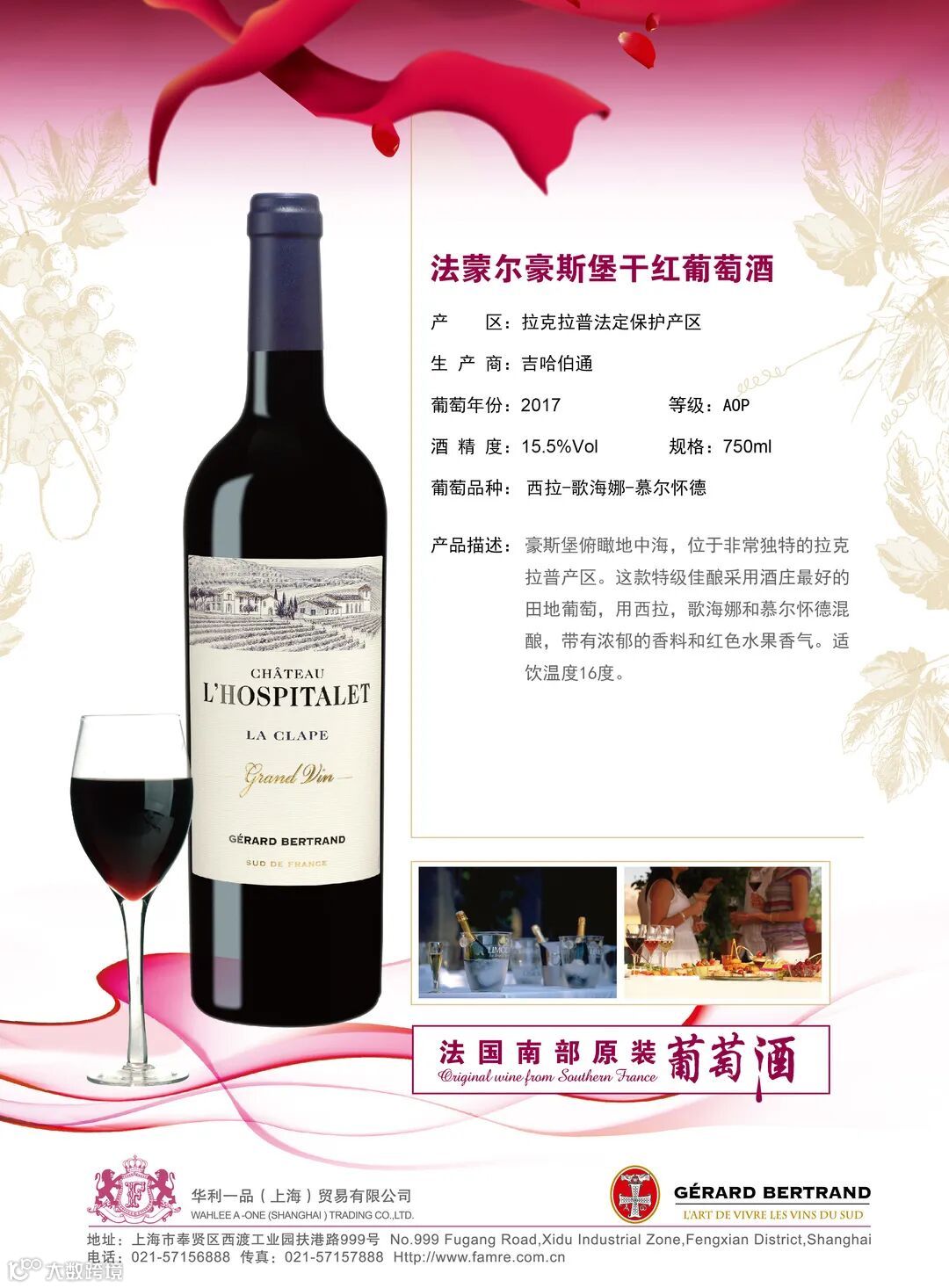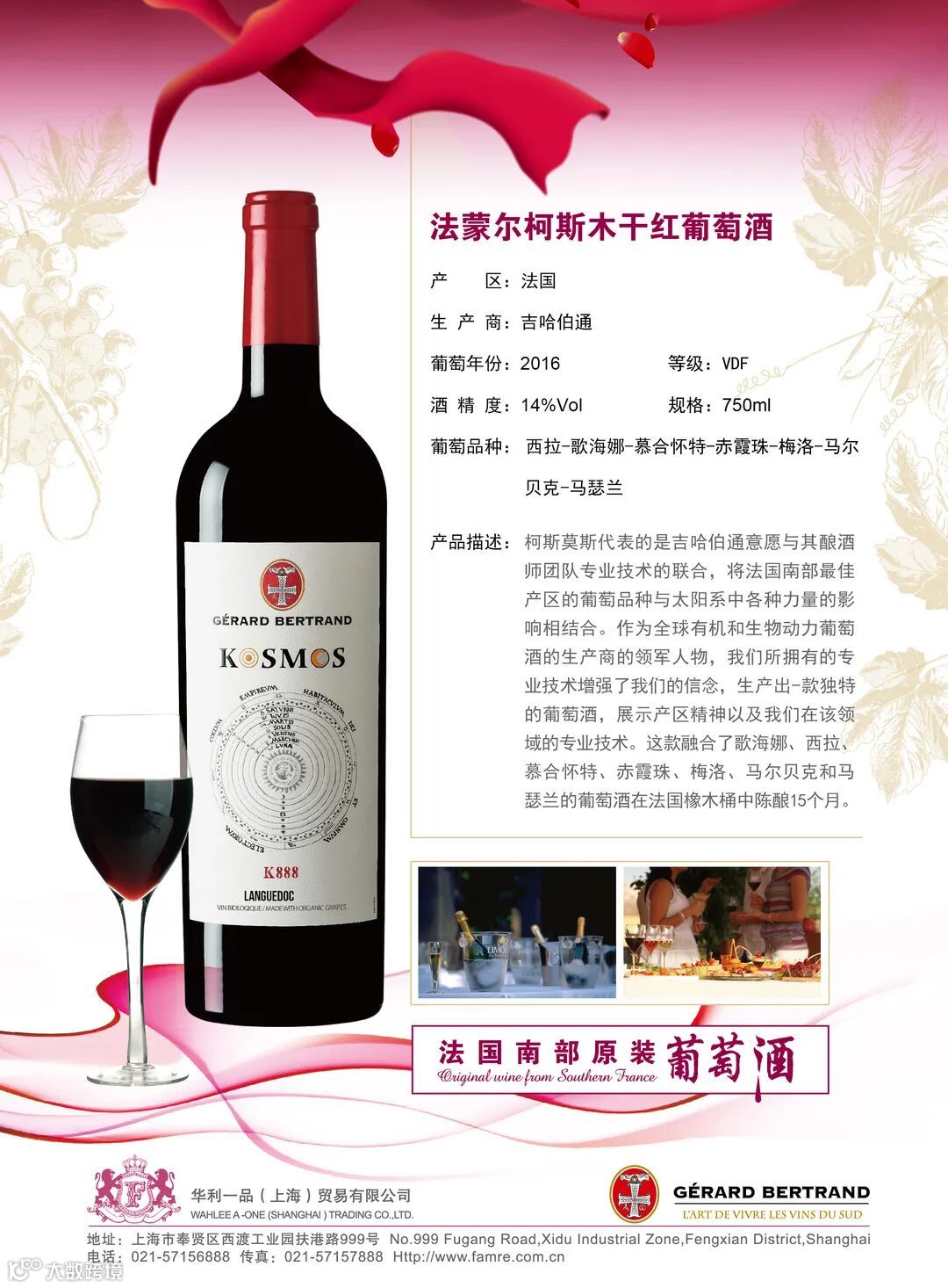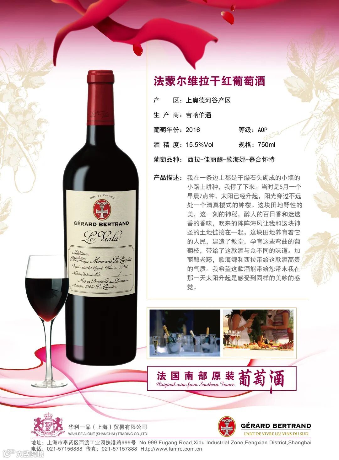 华利一品(上海)贸易有限公司成立和“FAMRE”法蒙尔品牌注册,是法国南部大区合作社,是中国及港澳台的独家销售代表法国南部葡萄酒协会理事会成员,是欧饮文化发展及法国南部葡萄酒种植者协会合作伙伴,SUD DE FRANCE中国官方进口商