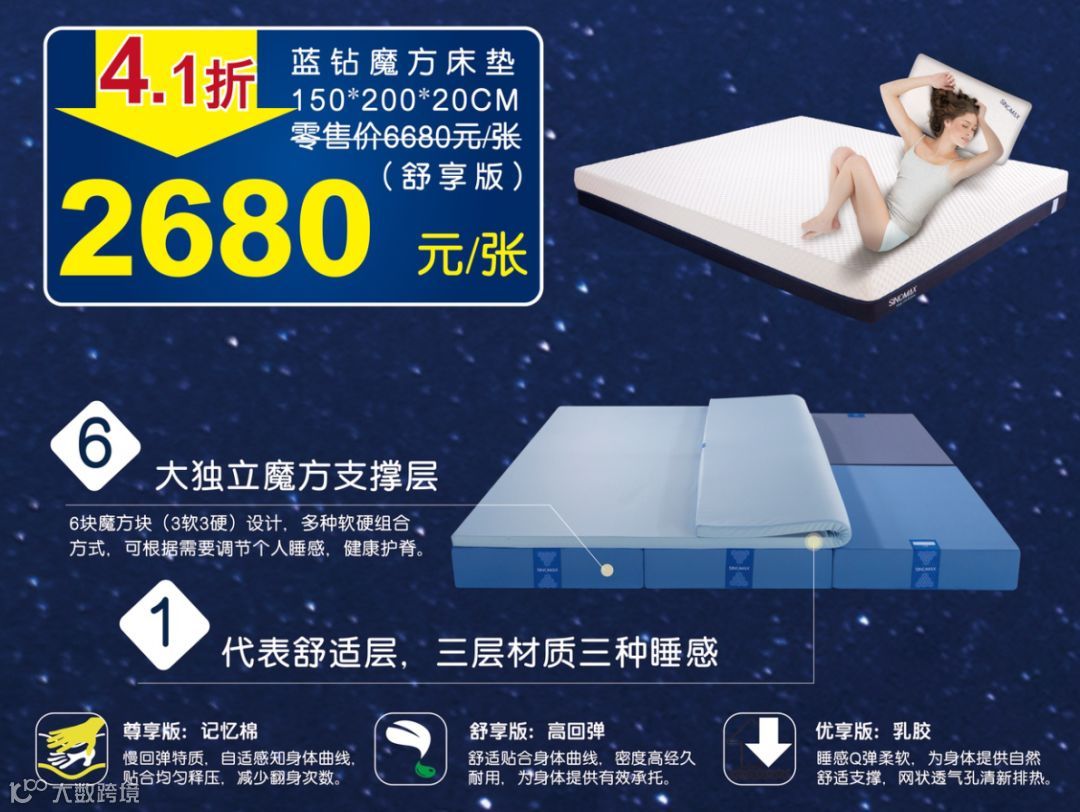 新品:蓝钻智慧魔方床垫(舒享版):智享睡眠,六块魔方+一张薄垫(薄垫可选乳胶\记忆棉\高回弹棉),根据自己喜好,释压护脊,好睡眠好健康,150*200*20CM活动特惠2680元,零售价6680元,欢迎到店体验!