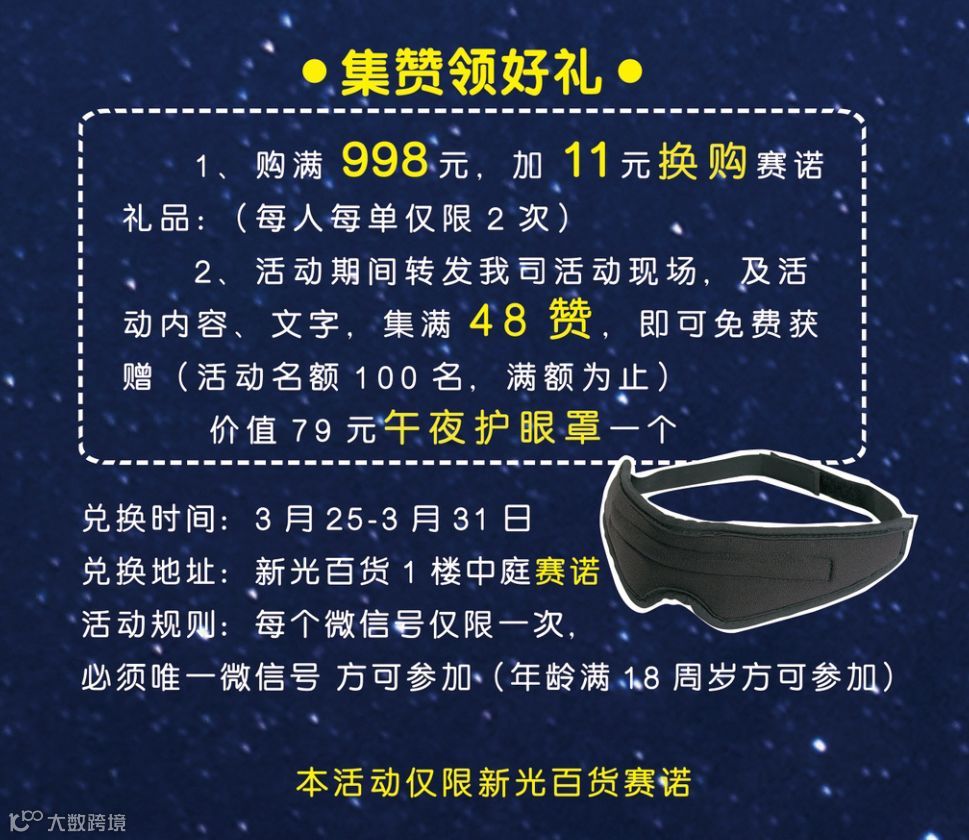 2)活动转发活动信息,内容,集满48赞,即可免费获赠价值79元护眼罩一个;(活动详情请到赛诺活动现场咨询)