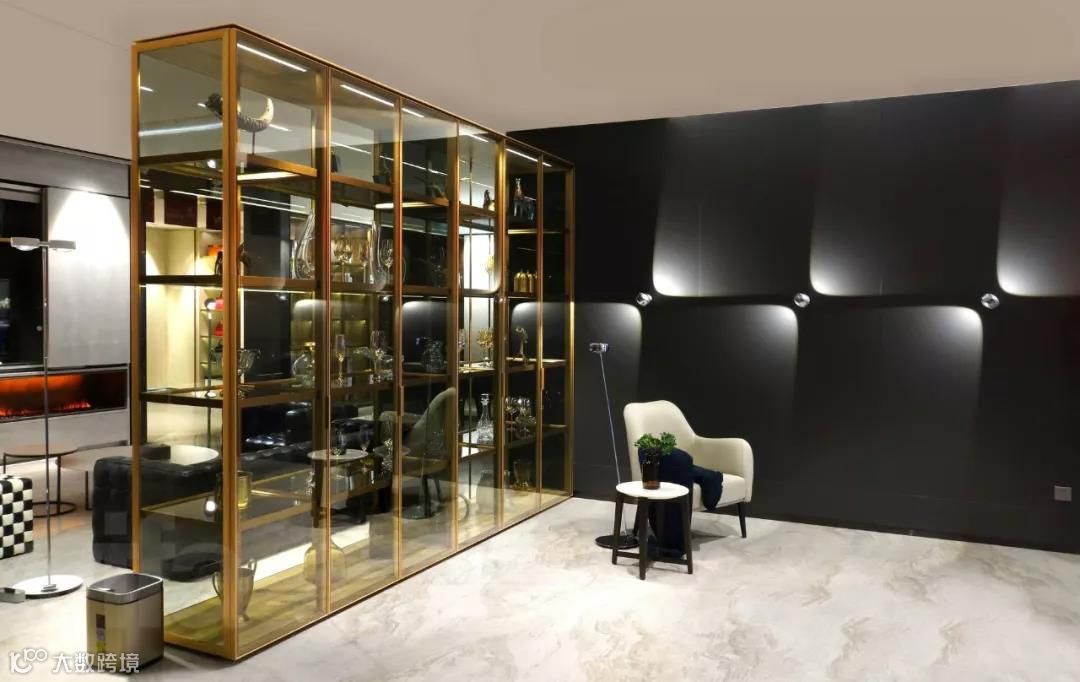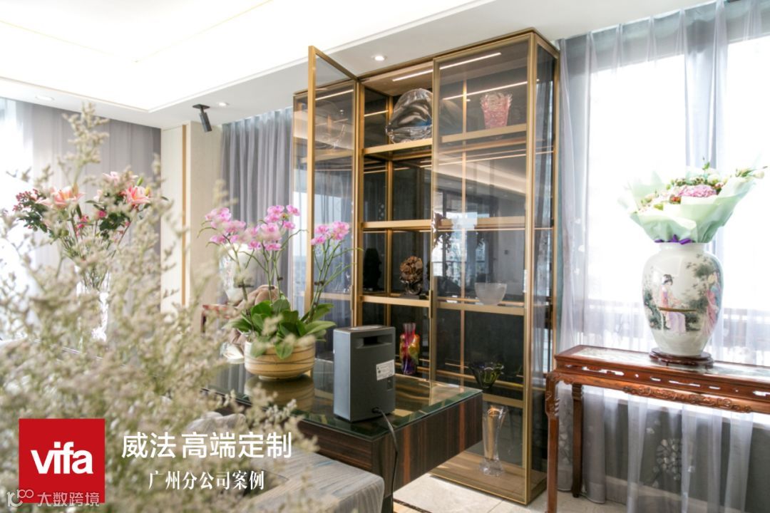 客厅选用镁铝合金玻璃柜作为展示柜,防紫外线的钢化玻璃,能有效隔绝外部环境中的紫外线,且能防止对柜内收藏品造成变色、老化等伤害。