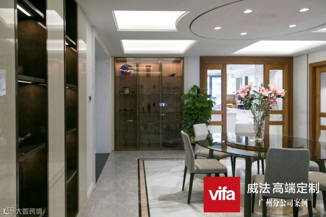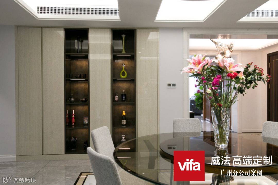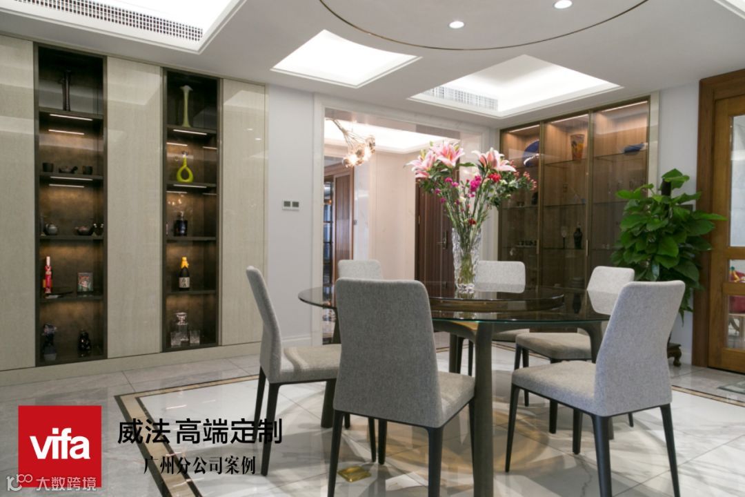 餐厅正中央摆放了一玻璃圆桌,围绕餐厅威法设计了白檀的餐边柜和镁铝合金玻璃展示柜。白檀产品为全球范围内威法独家专供,白檀木纹的自然元素结合亮光质感的烤漆工艺,再配以库斯科铜开放柜,色调柔和,令一家人的用餐时光更加温馨雅致。