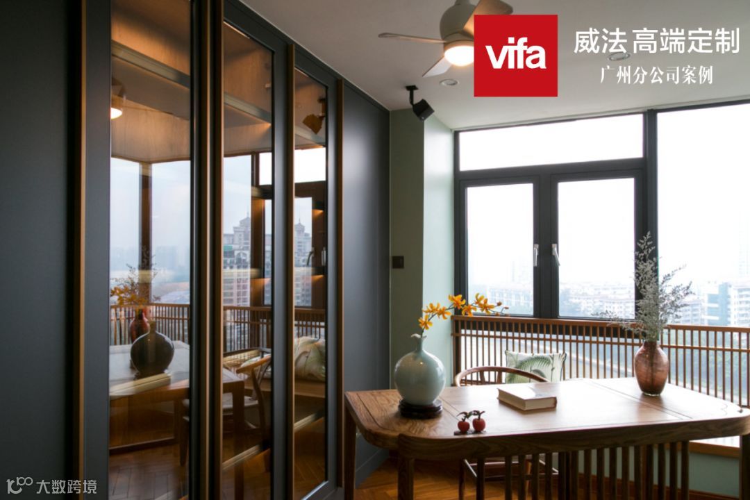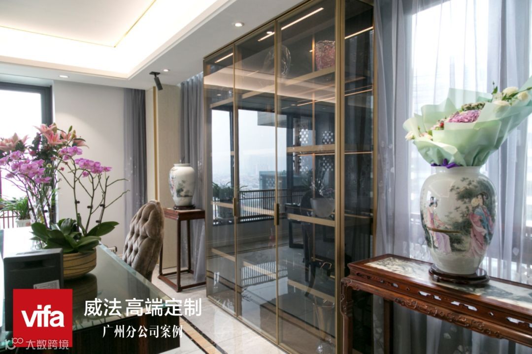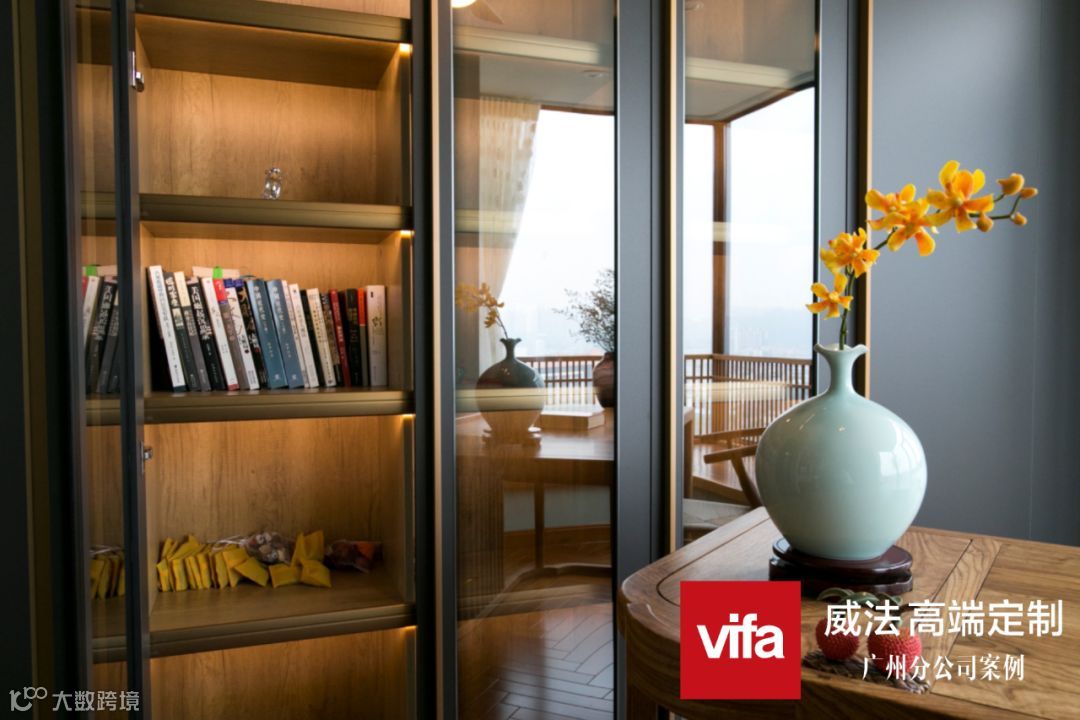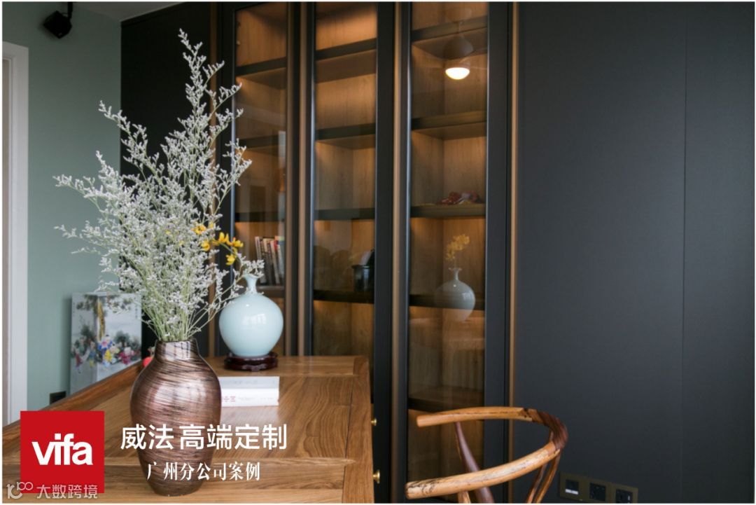 在设计上,大胆选用绒面灰,以一通到顶的门板体现,中间加入玻璃门,极具展示效果,亦具收纳效果。当绒面灰遇上新中式,带来与别不同的设计感觉,体现出威法产品的功能性和百搭性。
