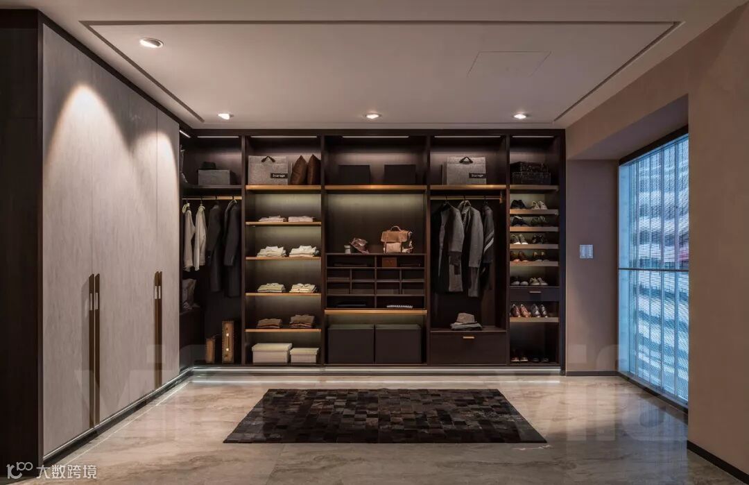 入门的衣柜中,可存放当季或常用的衣物、首饰,一体化的设计(柜子、护墙板)使墙壁既是墙,亦是柜子,大大提升了空间的收纳能力。